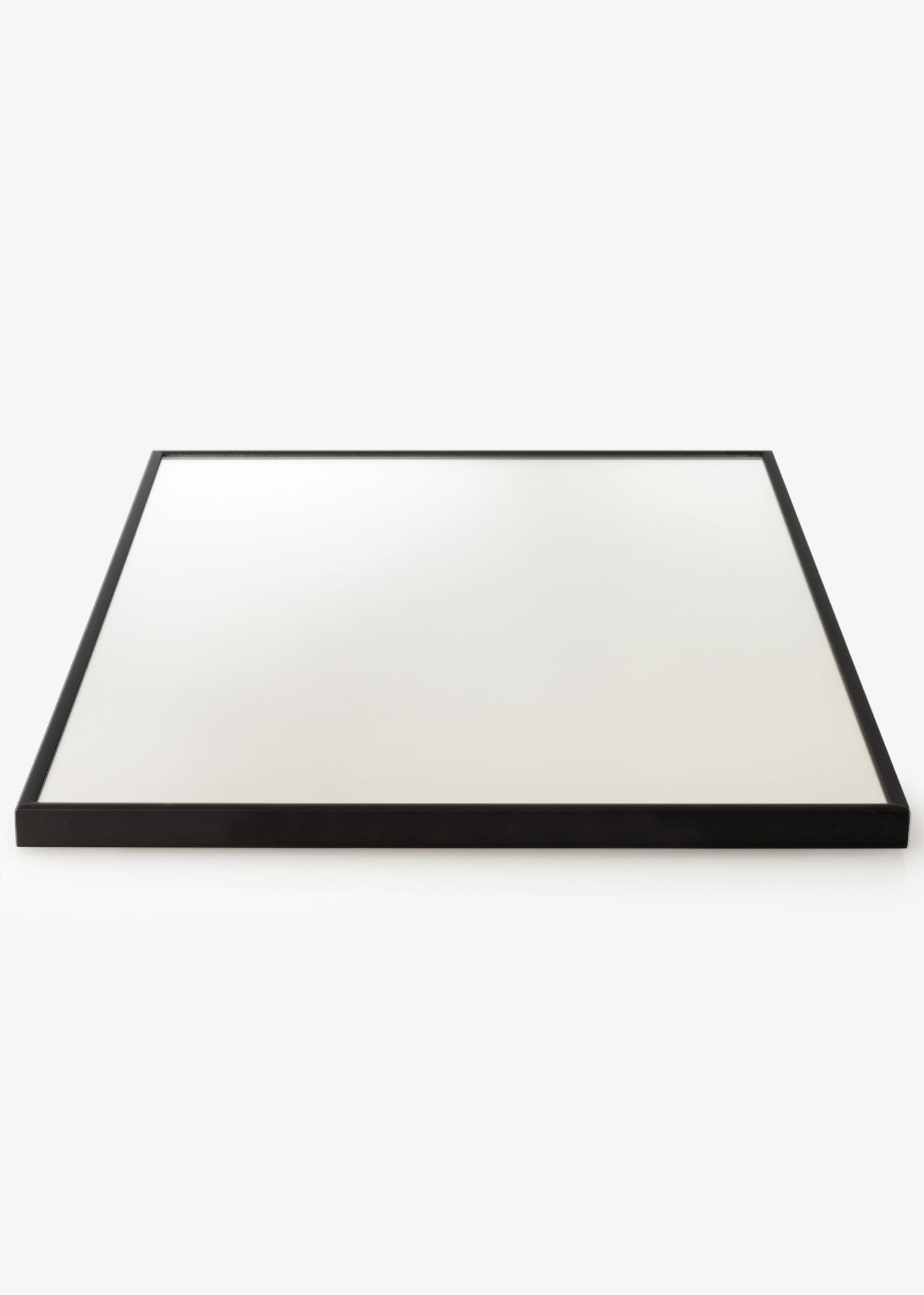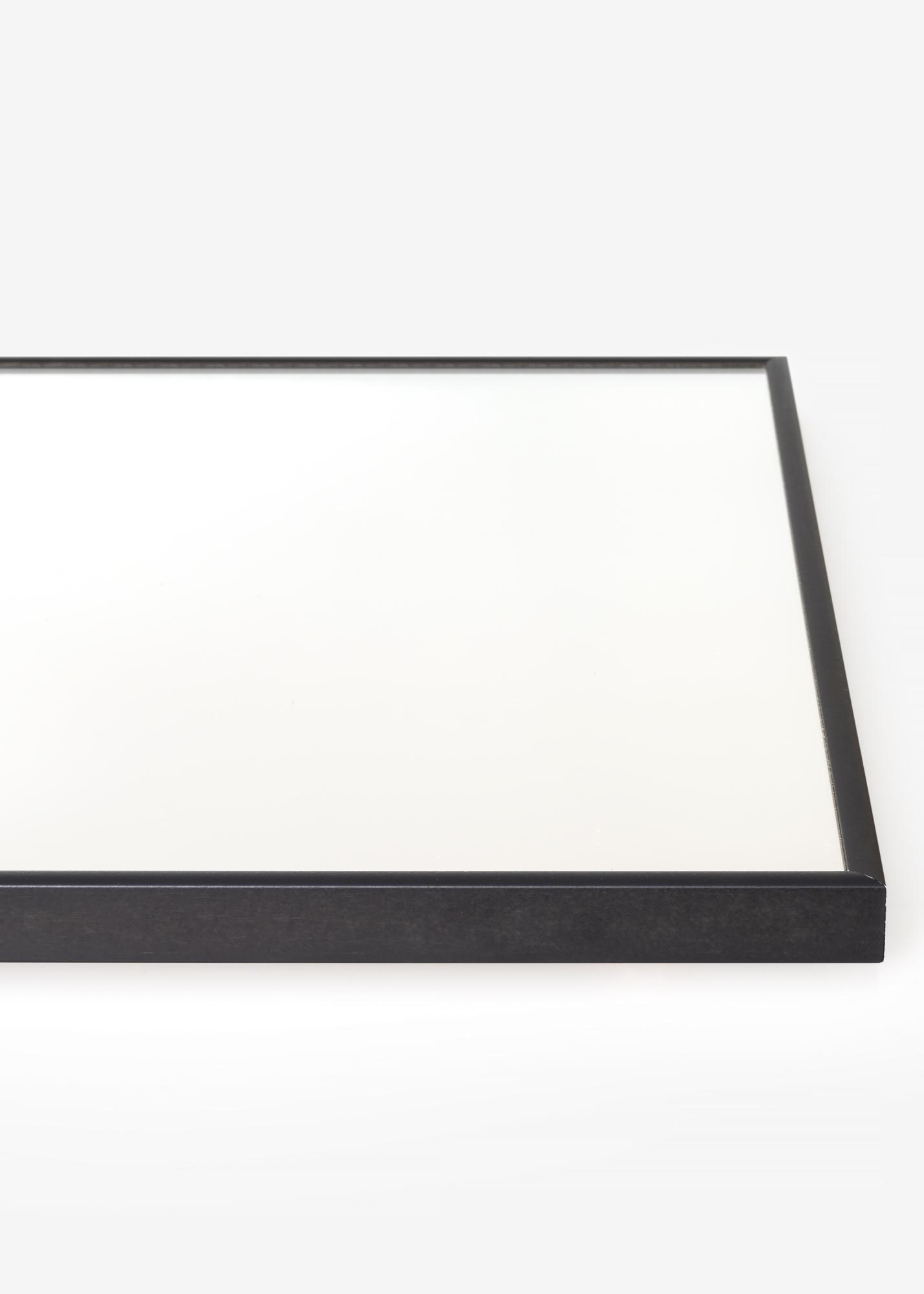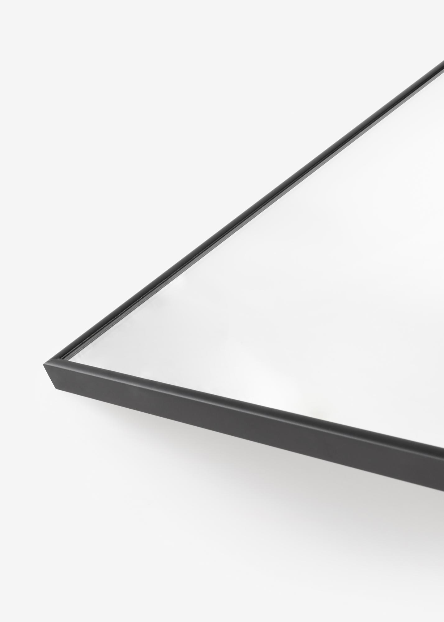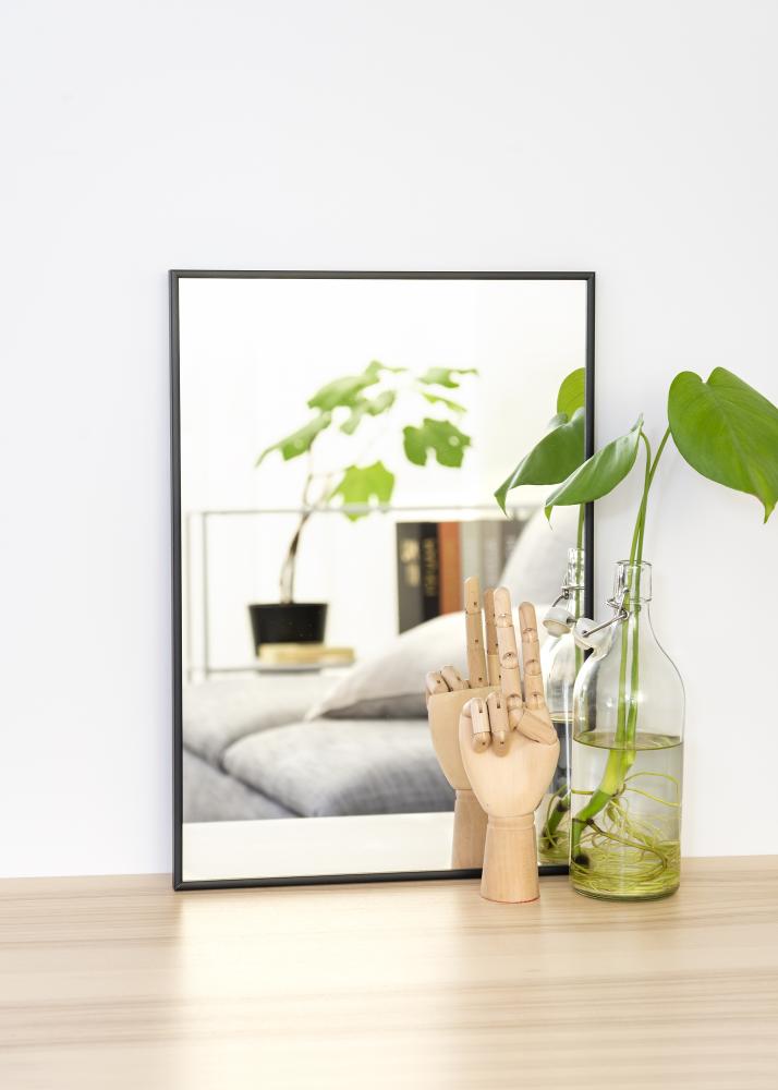 Un miroir épuré au cadre en aluminium noir. Le miroir est équipé de supports muraux judicieux, ce qui le rend facile à accrocher.