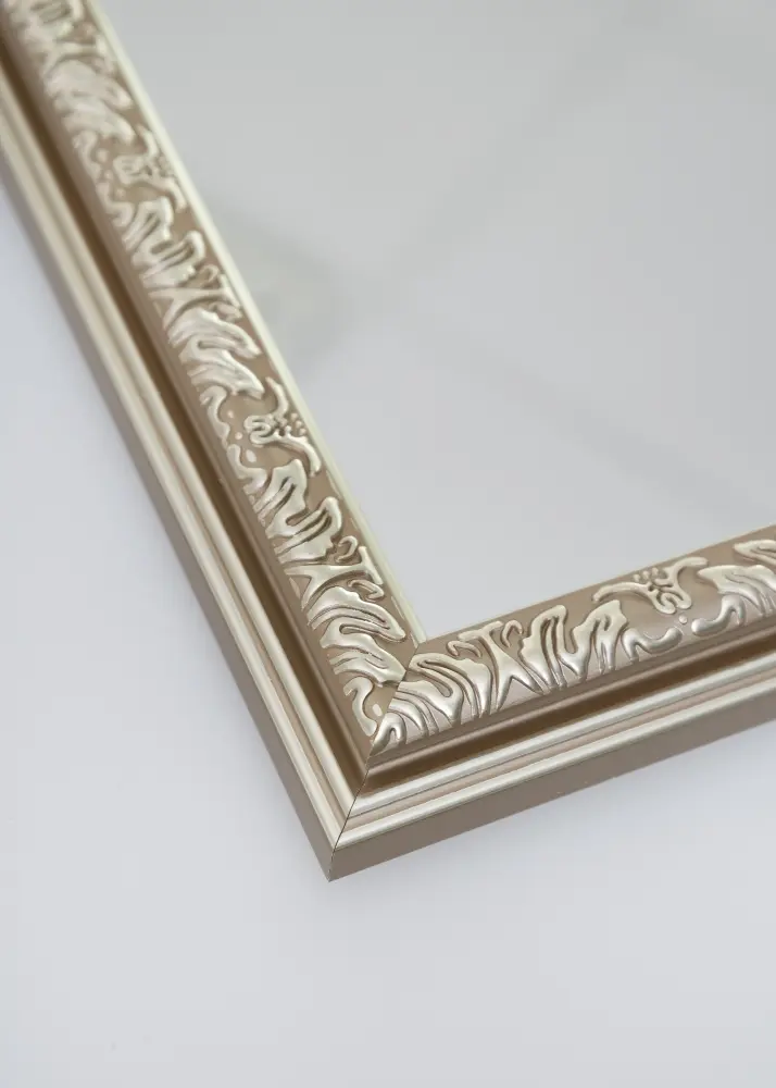 Lancer le sélecteur de cadres »Nost Argent est le nom d'une série de miroirs muraux. Le cadre est richement décoré de symboles irréguliers qui donnent une impression légèrement mystérieuse.