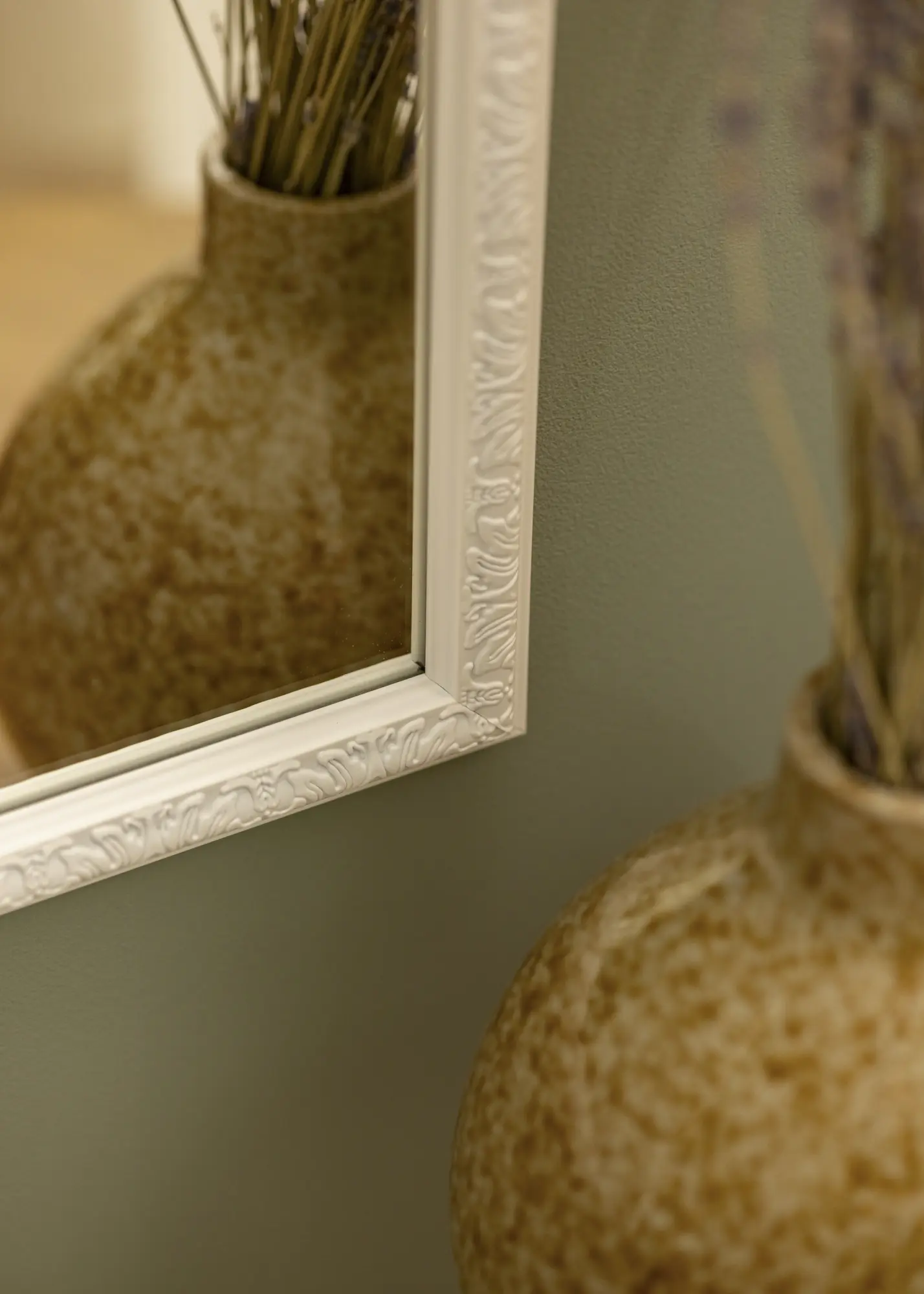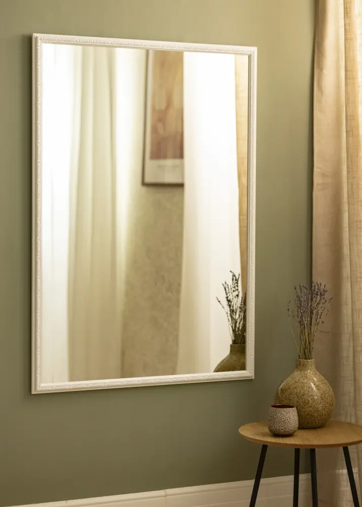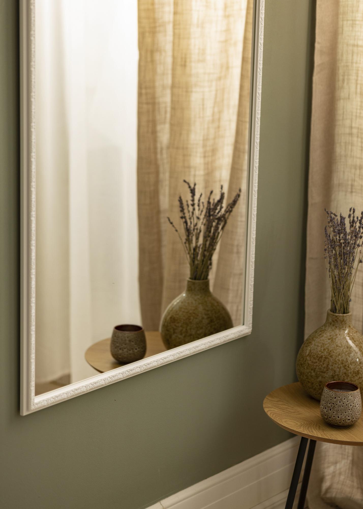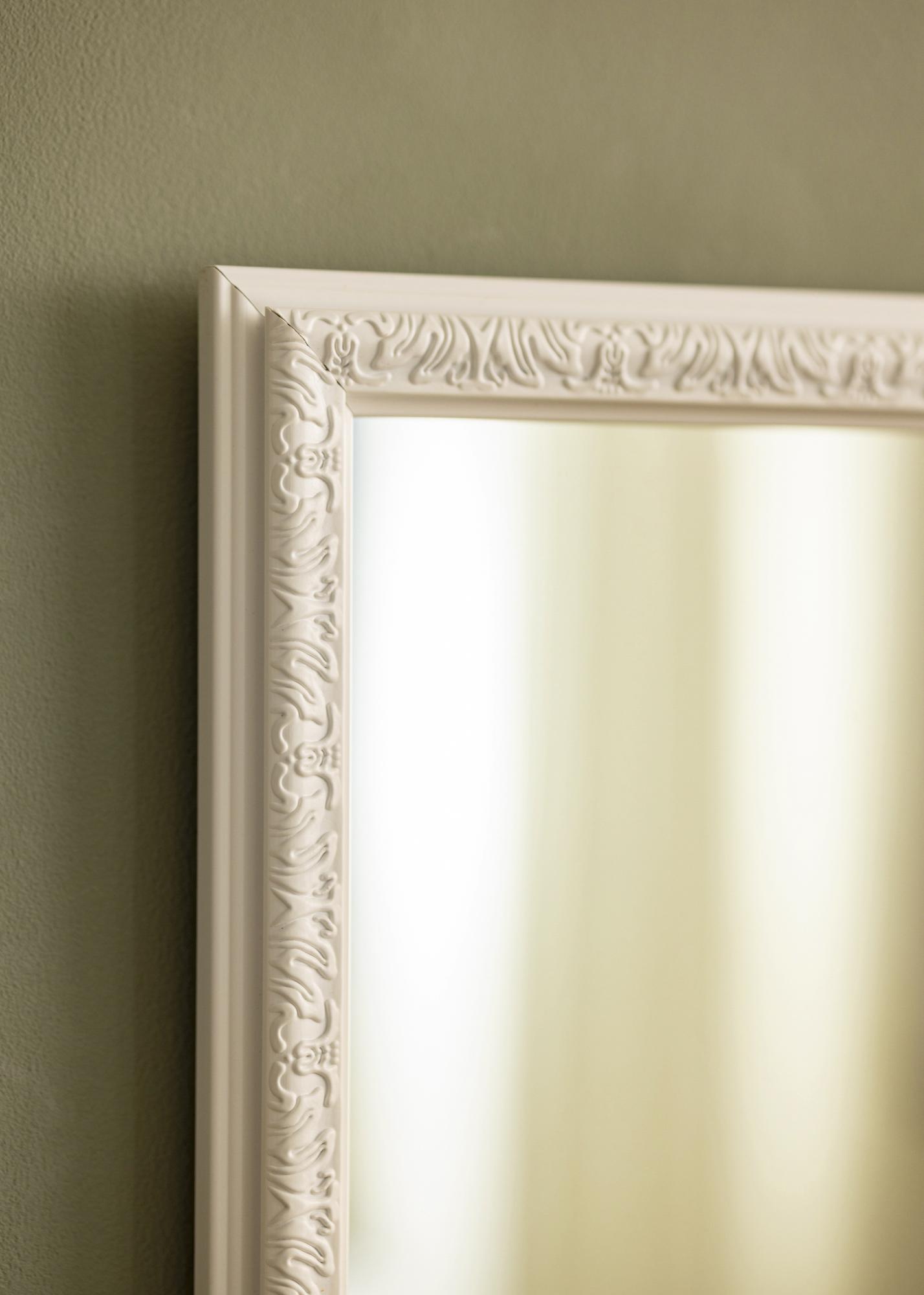 Ce miroir mural est un détail d'intérieur élégant qui reflète magnifiquement la lumière des diverses sources lumineuses de la pièce où il est placé. La baguette de cadre blanche donne une impression lumineuse et fraîche, se mariant parfaitement avec le joli profil décoré de beaux motifs .