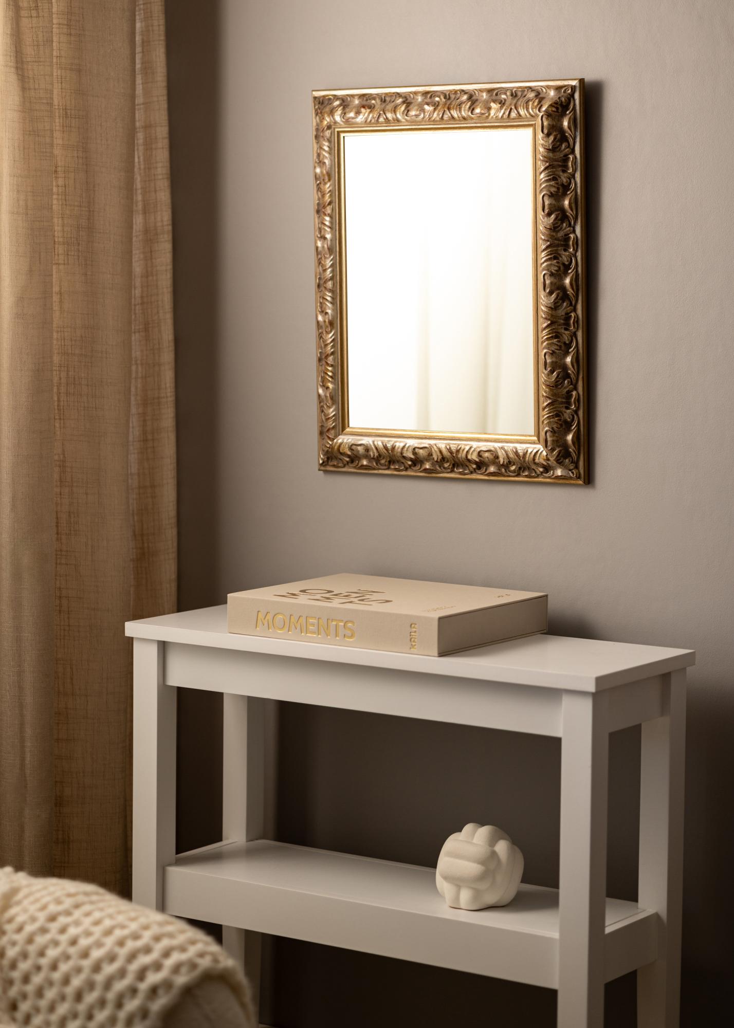Le cadre est fabriqué en pin avec une finition argent antique avec des détails dorés subtils et des touches de rouge. Cette combinaison de couleurs crée un beau contraste et donne au miroir une expression classique et sophistiquée. Son apparence décorative fait que le miroir est parfait pour les encadrements où une sensation élégante est recherchée.
