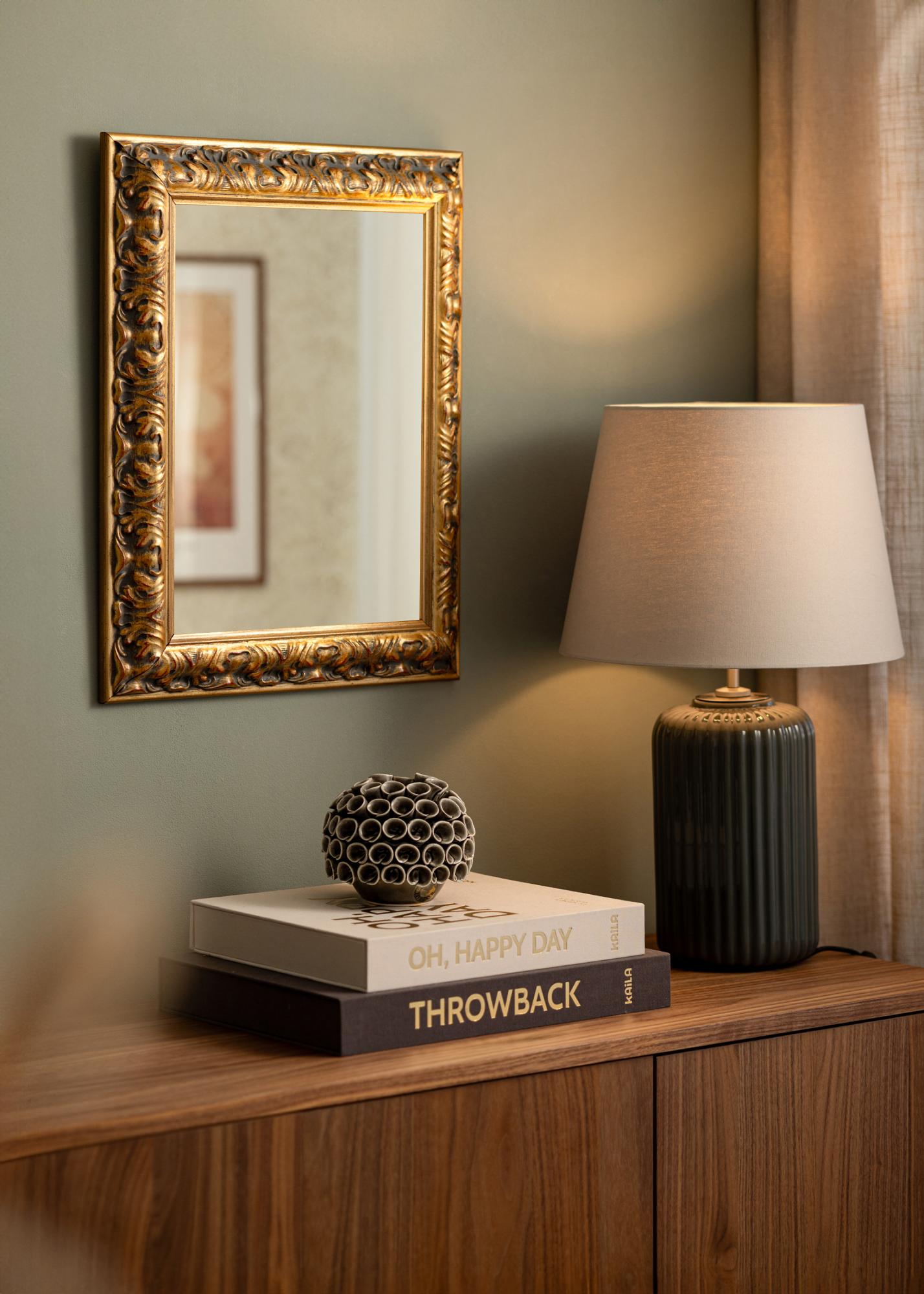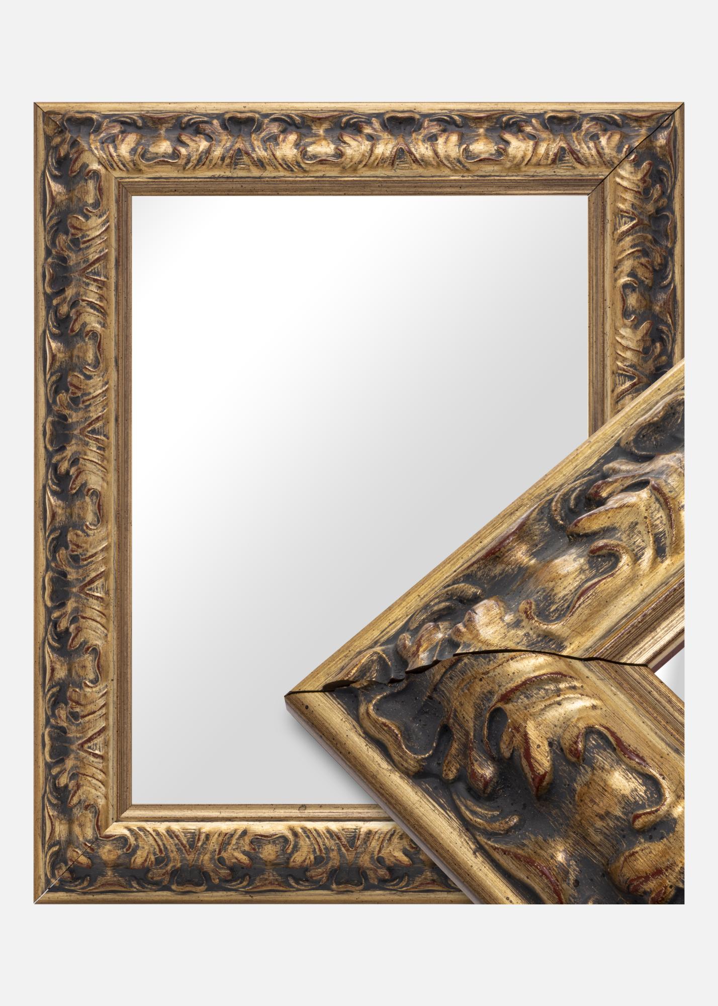 Le miroir Odin Or/Rouge est un miroir élégant et stylé fabriqué selon vos propres dimensions. Avec son cadre doré orné et sa patine antique, il devient un élément accrocheur dans n'importe quelle pièce. Le cadre, qui a une largeur de 64 mm et une profondeur de 38,5 mm, est fabriqué en pin et orné de détails de style baroque. Les motifs sculptés en relief donnent au miroir un caractère unique et sont accentués par un subtil contraste entre or et accents sombres.