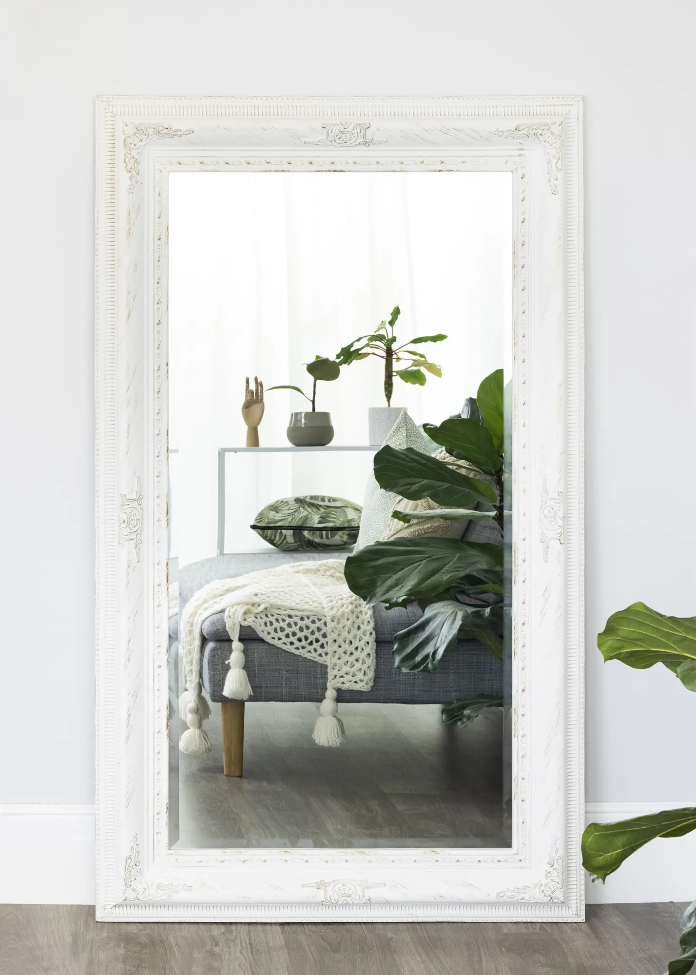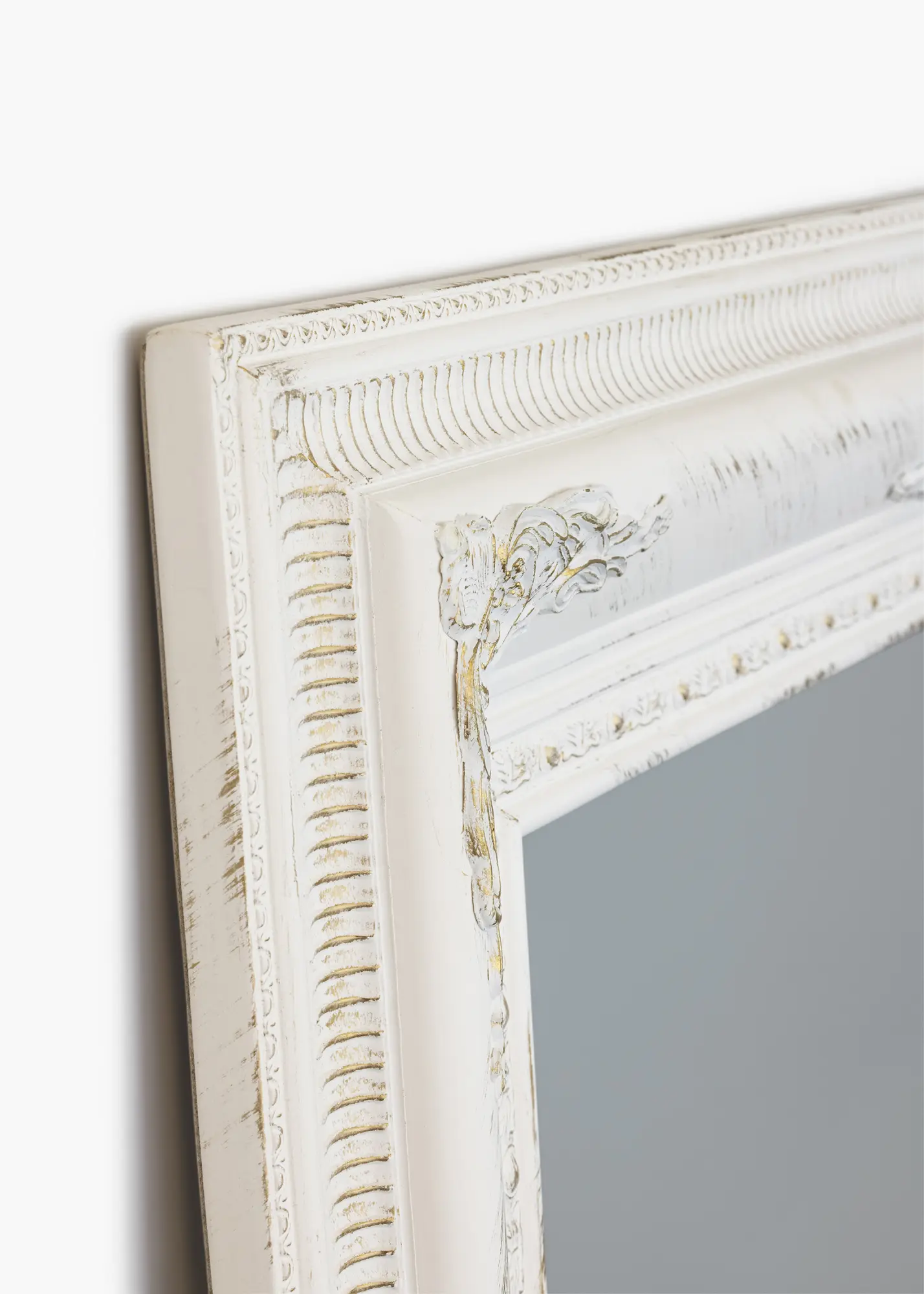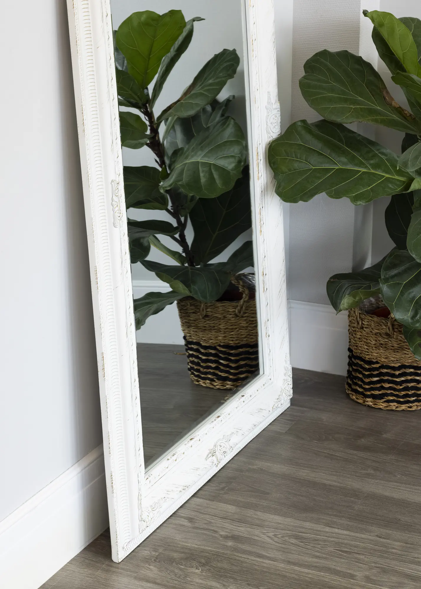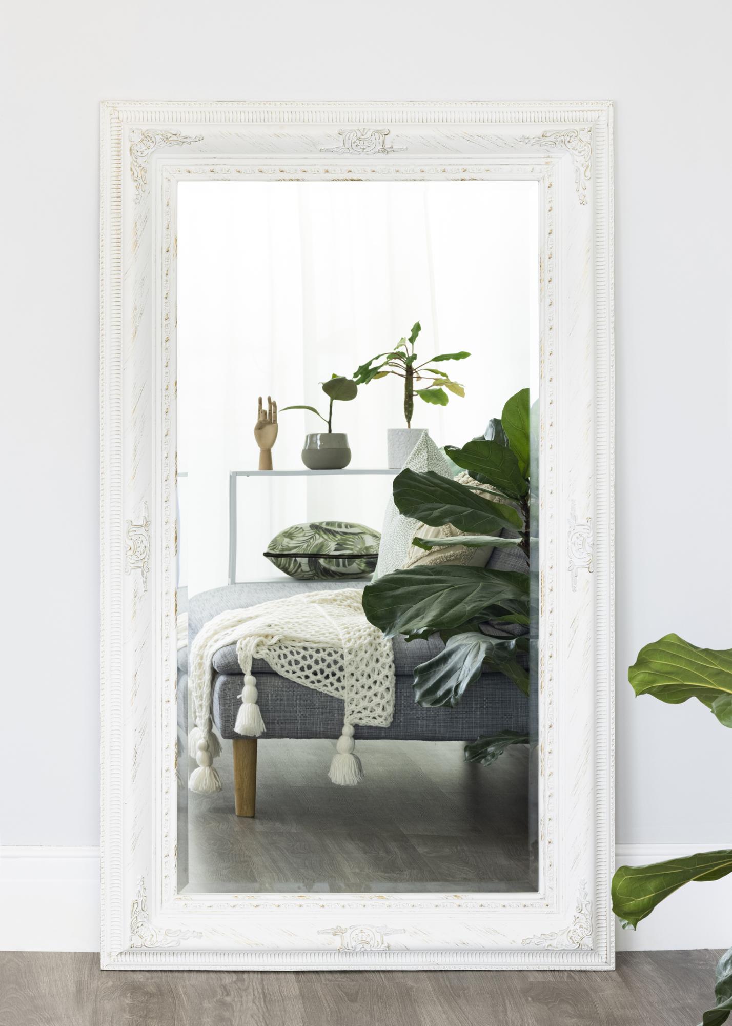 Miroir en blanc avec une ambiance romantique, parfait pour ceux qui veulent créer un intérieur qui respire les roses, le glamour et les temps passés. Le miroir est beau à accrocher à la fois dans la salle de bain au-dessus d'un meuble plus grand comme dans le reste de la maison, sa taille permet de le placer sur le mur au-dessus d'un buffet robuste ou d'un canapé. Le miroir peut également être utilisé dans un élément d'un mur de tableaux avec des peintures encadrées avec des cadres blancs au style similaire et il aide à illuminer une pièce sombre s'il est accroché en face d'une fenêtre.