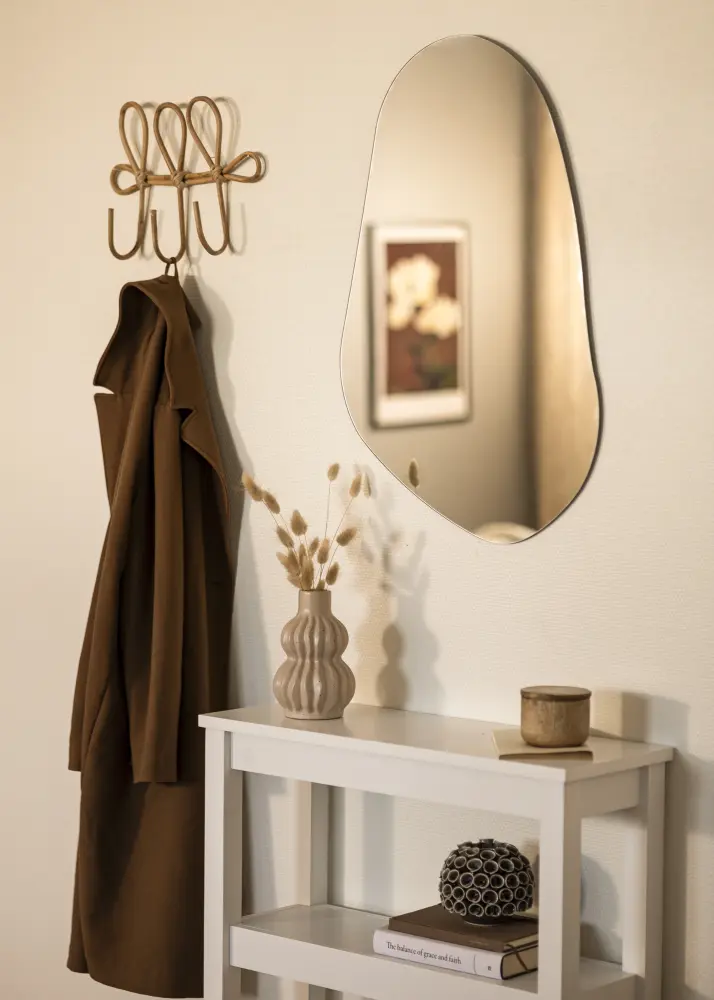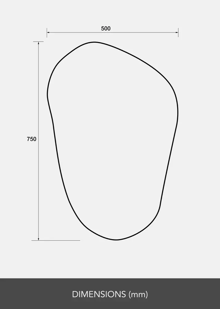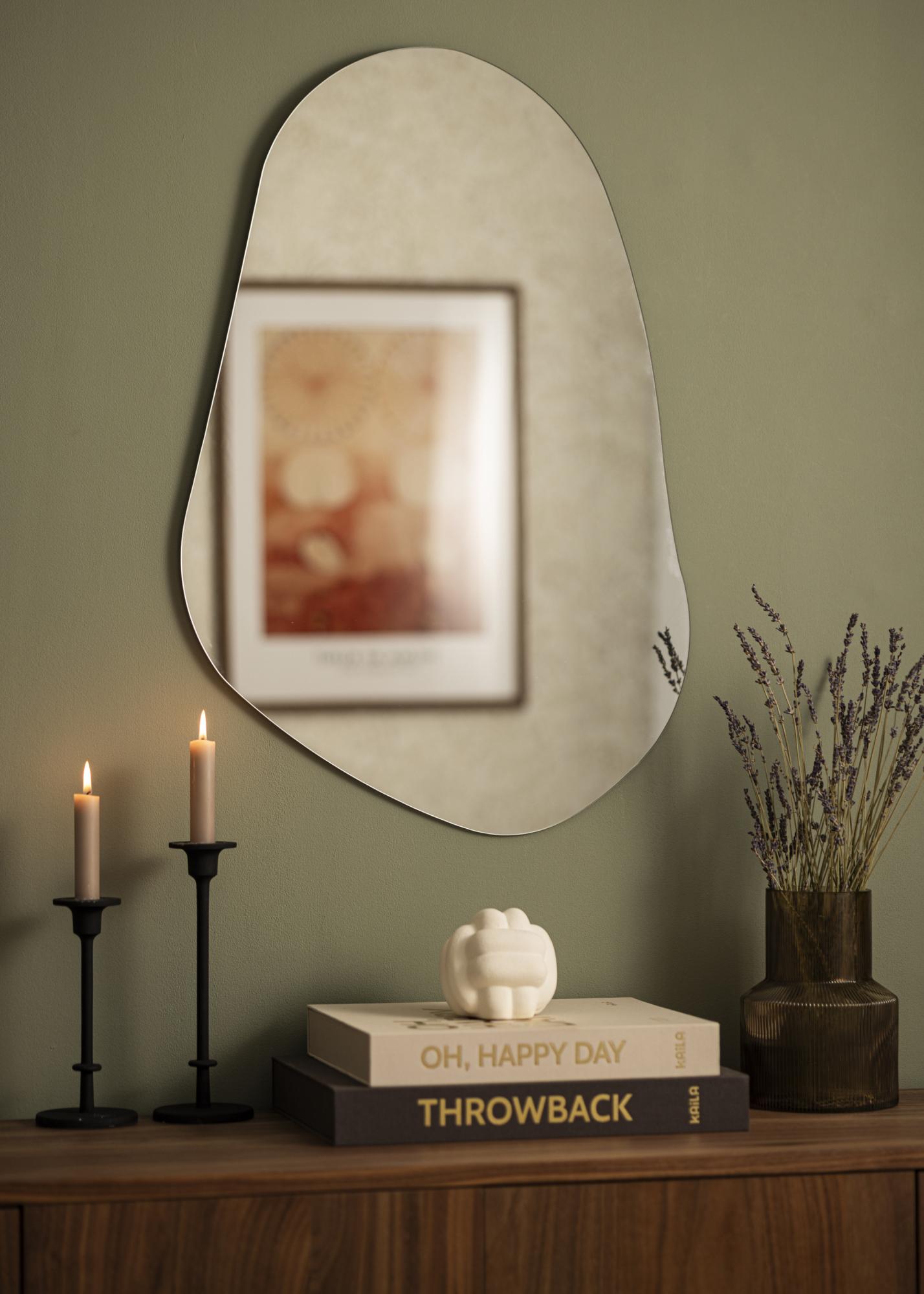 Ce Miroir présente une forme organique, asymétrique et doucement ondulée qui apporte une touche moderne et artistique à votre intérieur. Avec ses courbes arrondies et l'absence de bords droits, il évoque une silhouette dessinée à main levée, semblable à une pierre naturellement façonnée ou à une goutte étirée.