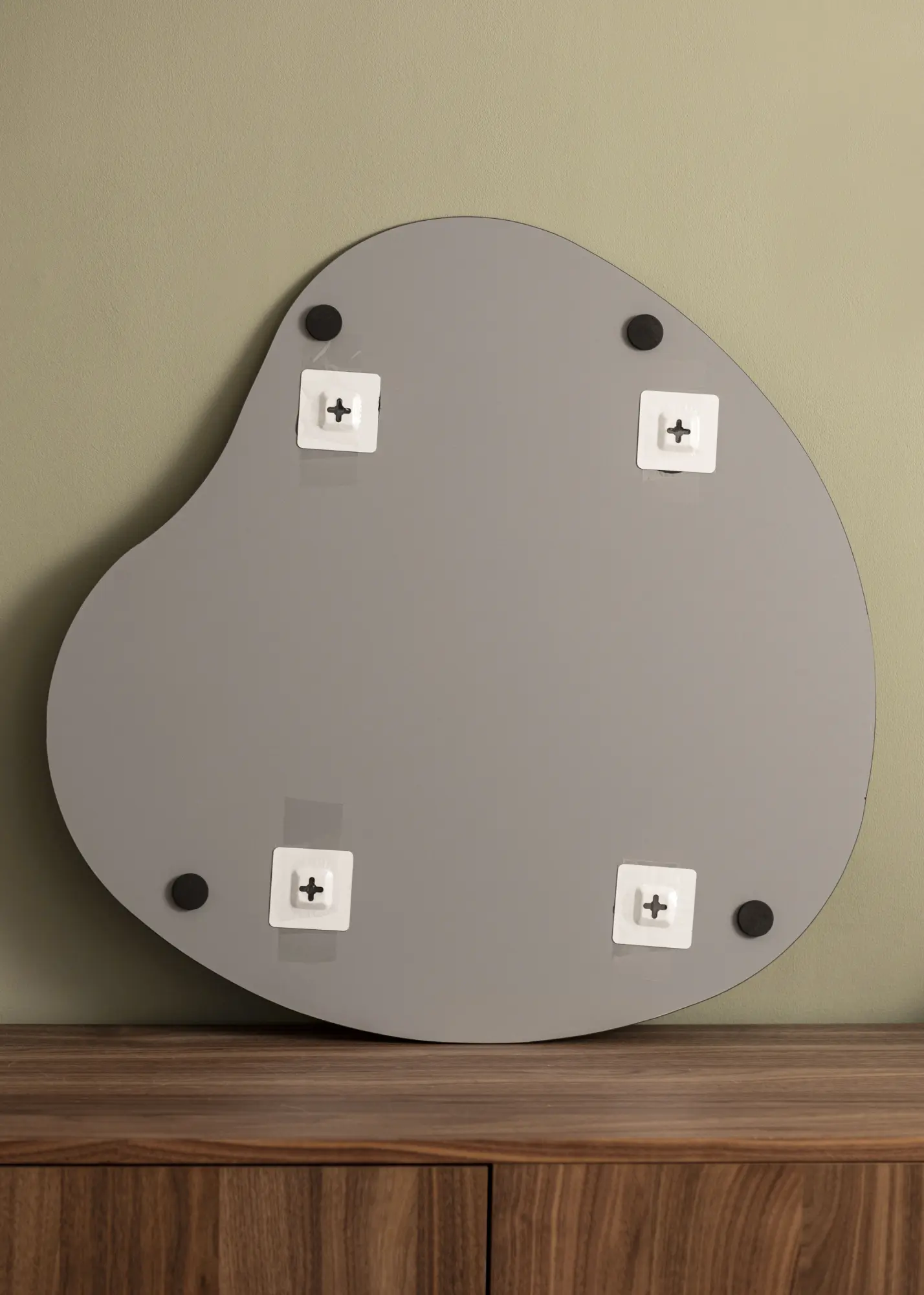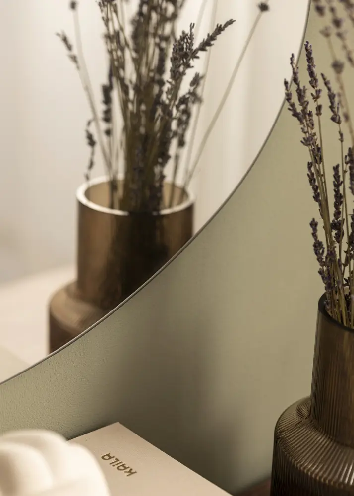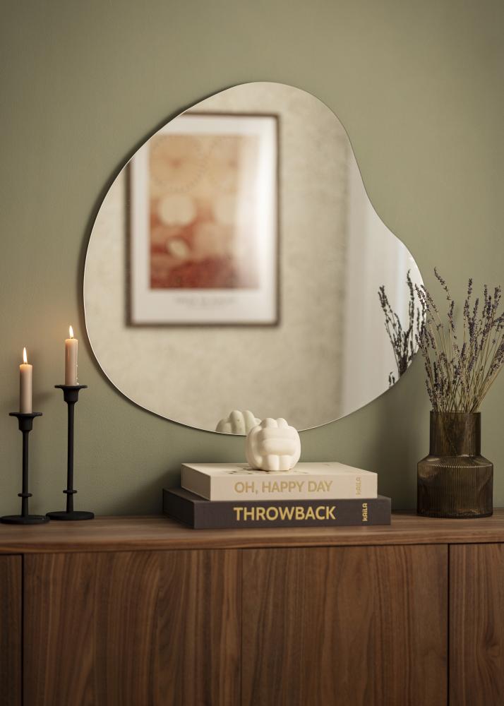 Le miroir présente une forme doucement profilée et asymétrique qui oscille gracieusement et donne l'impression de mouvement et de douceur. Ce design fait du miroir un détail artistique sur le mur tout en conservant sa fonctionnalité pratique.