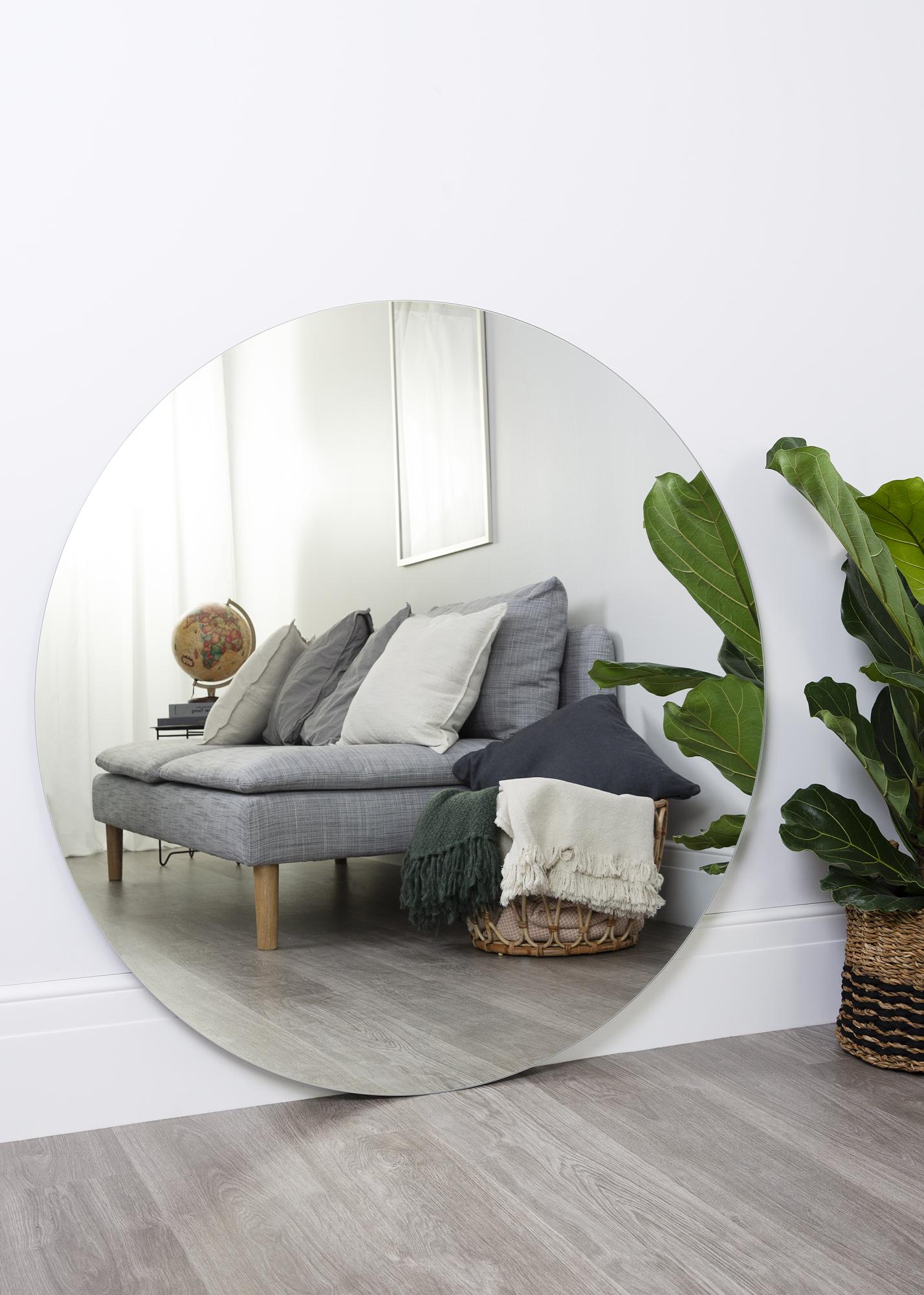Miroir rond de 110 cm qui fait partie d'une série de miroirs. Le miroir est extrêmement fin et élégant et s'adapte à tous les types de pièces et de styles de décoration.