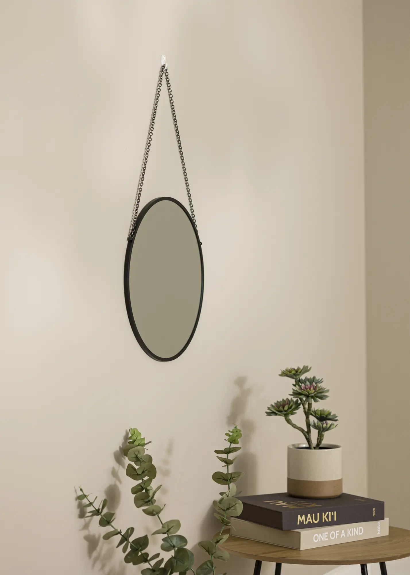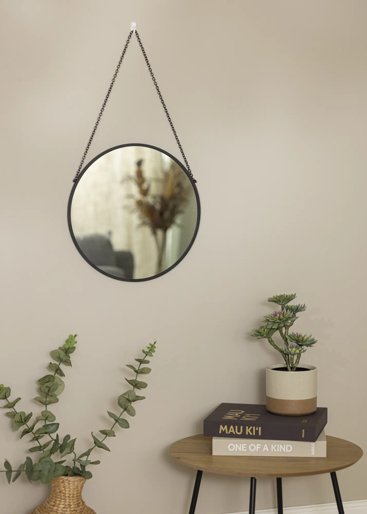 Un miroir qui s'accroche au mur par une chaîne a une prestance particulière, et est très décoratif peu importe la pièce dans lequel il se trouve. Ce miroir mural rond se suspend au mur à l'aide d'une chaîne en métal noir qui s'accorde parfaitement avec le cadre du miroir lui-même en métal noir. Le cadre a une profondeur de seulement 8 mm, ce qui lui donne son apparence soignée et élégante.