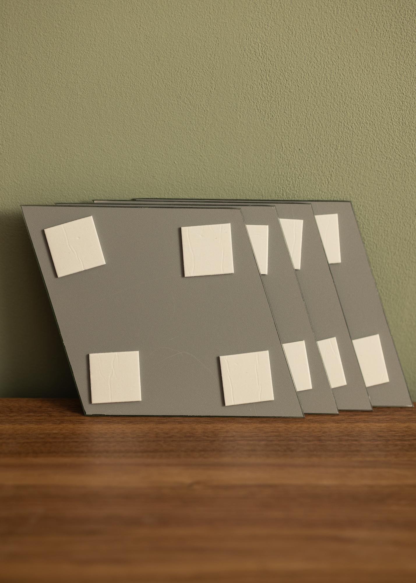 Ces miroirs super tendance sont vendus en lot de 4 et sont livrés avec du ruban adhésif double face avec lequel vous pouvez facilement les fixer au mur.