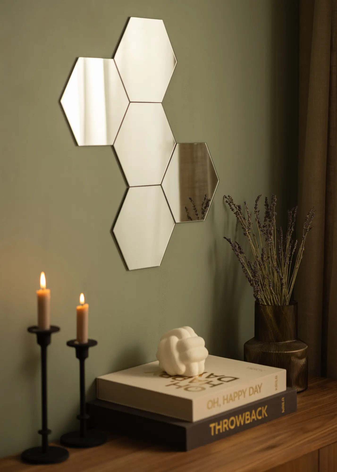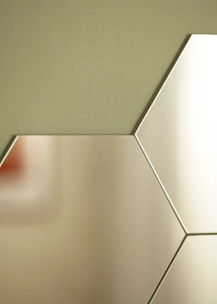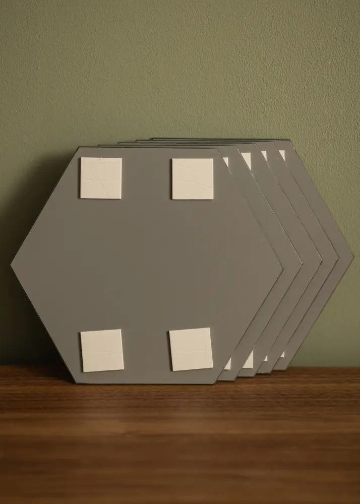 Ces miroirs super tendance de forme hexagonale sont vendus en lot de 5 et sont livrés avec du ruban adhésif double face avec lequel vous pouvez facilement les fixer au mur.