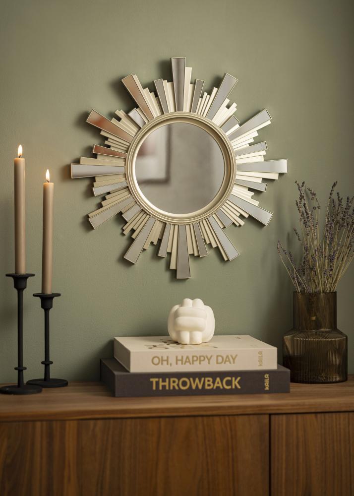 Ce miroir rond a un cadre très décoratif en forme de soleil. Le cadre est de couleur or, ce qui donne au miroir une apparence élégante et nette.