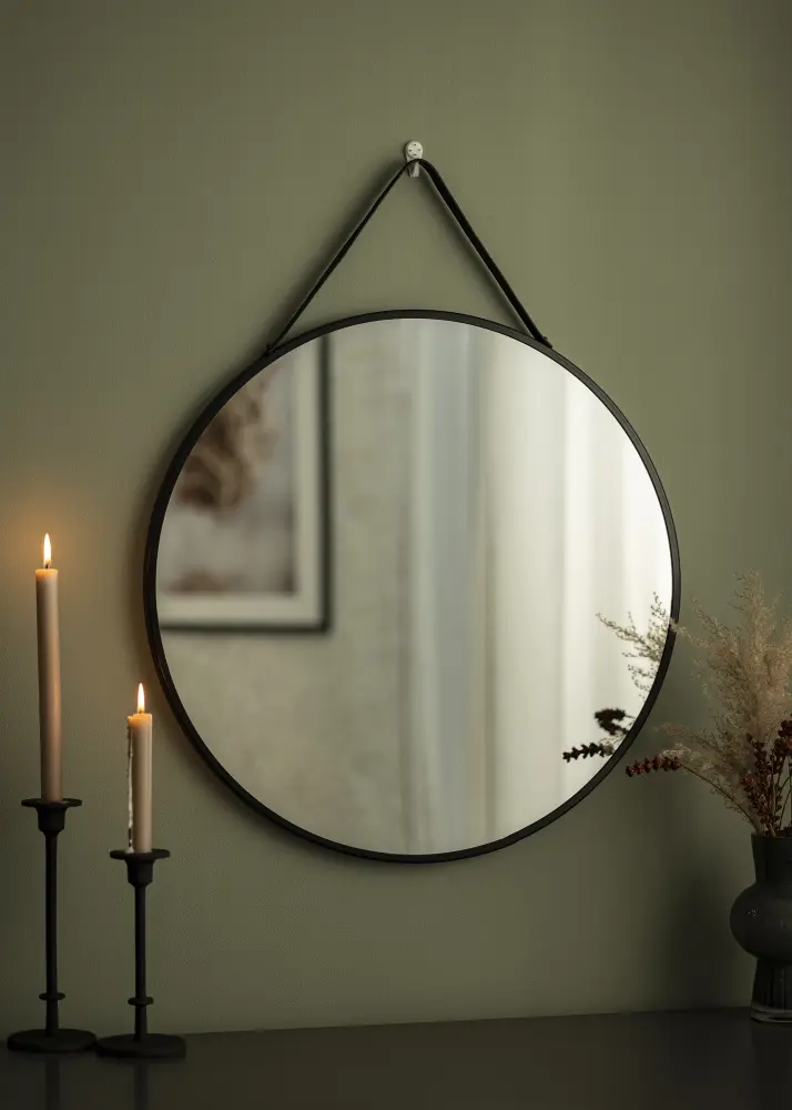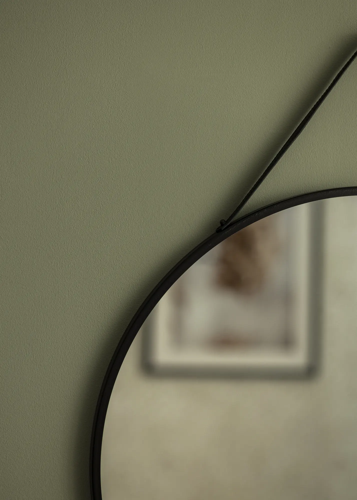Trapani est un miroir mural esthétique avec ce petit plus. Le miroir est rond et entouré d'un cadre épuré en métal noir. Le miroir se fixe au mur grâce à une lanière très décorative en cuir artificiel.