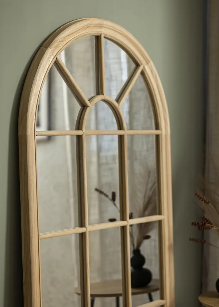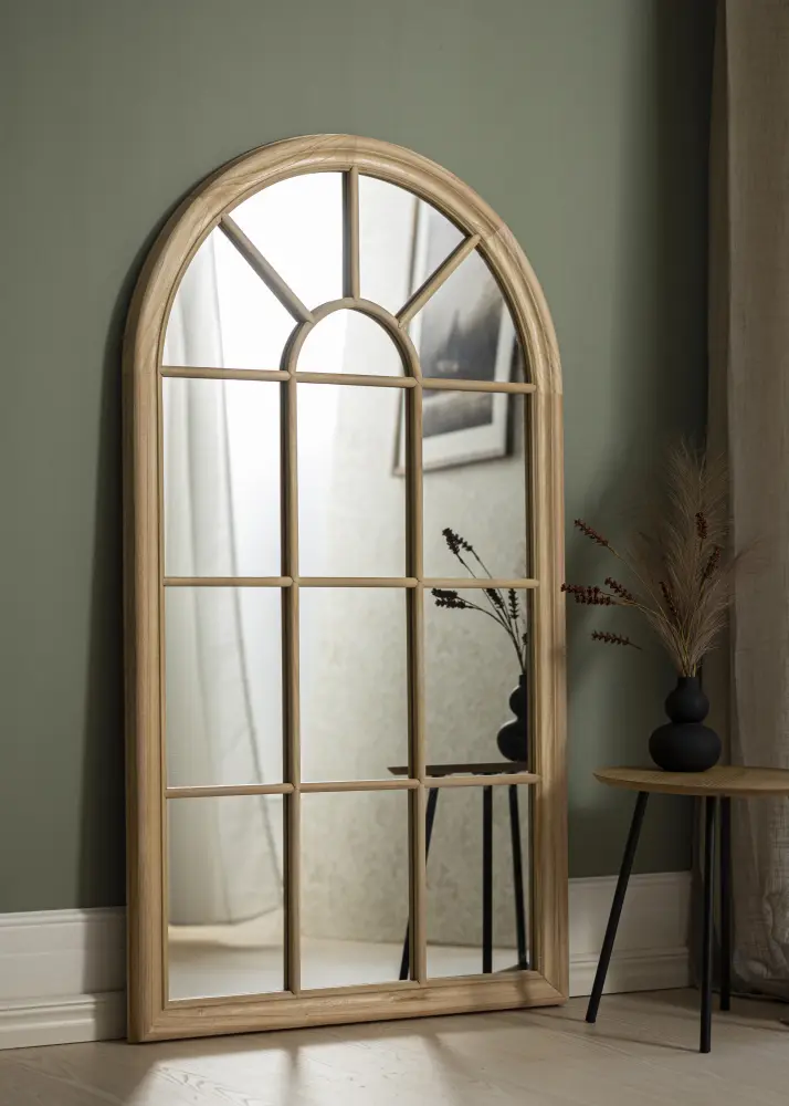 Découvrez l'élégance intemporelle de notre miroir arqué, un design qui évoque les vitraux gothiques historiques. Avec ses généreuses dimensions de 80x140 cm, ce miroir offre une vue magnifique et devient un élément imposant dans votre maison. Le cadre en bois naturel entoure le miroir et apporte une sensation de chaleur et de tradition à votre décoration intérieure.