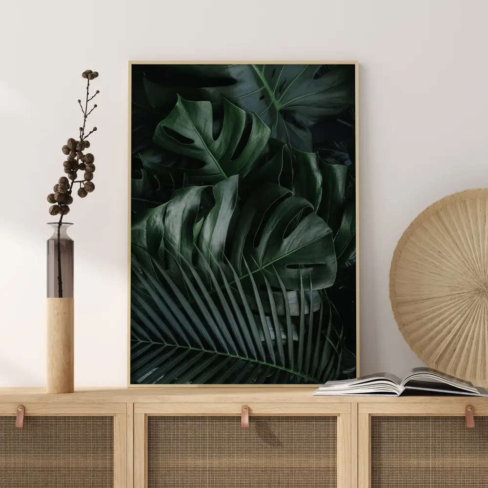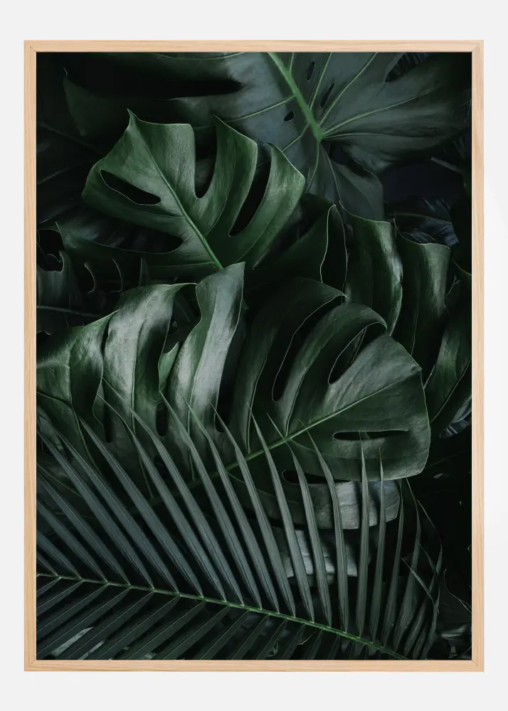 Une affiche feuille de Monstera verte et de feuilles de palmier. La lumière naturelle éclaire la partie supérieure des feuilles de Monstera, créant des nuances plus sombres. L'ensemble des feuilles en forme de scie crée une sensation de chaleur et de détente. Une impression parfaite pour tous ceux qui aiment les plantes.
