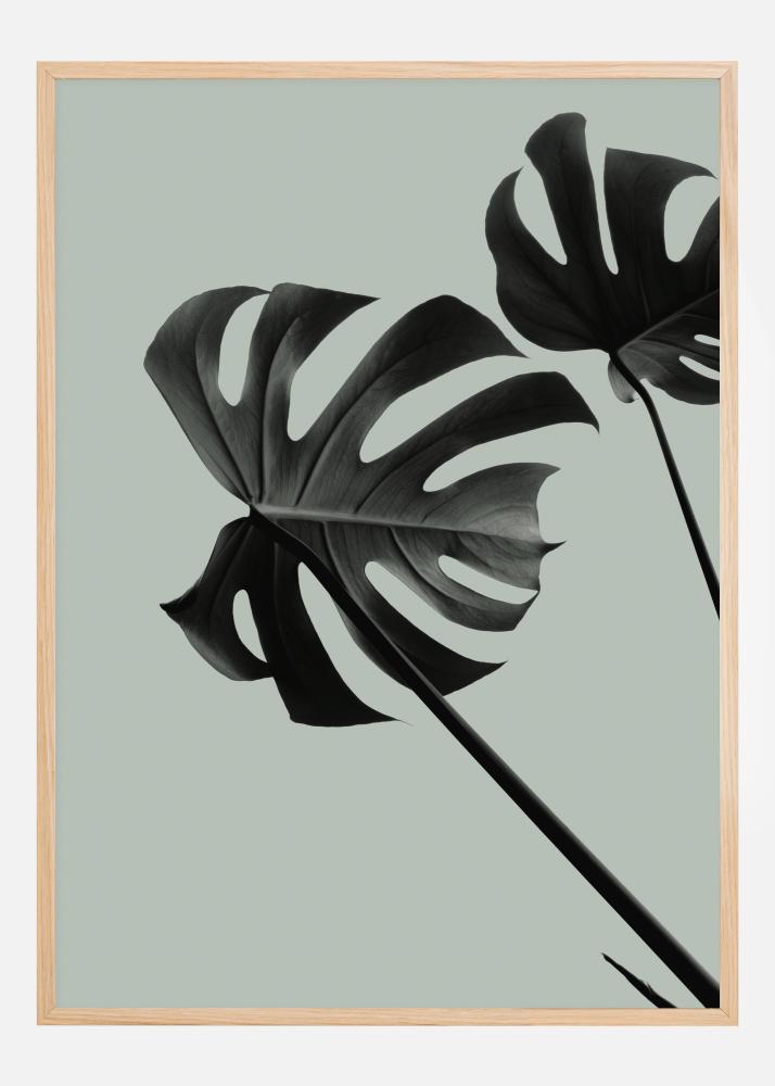 Affiche en gros plan, en noir et blanc, de deux feuilles de Monstera. Sur un fond gris mat, les feuilles en forme de cœur soulignent la luminosité émanant de leurs structures pennées. Parfait pour apporter l'émotion de ces feuilles en forme de cœur dans votre maison.