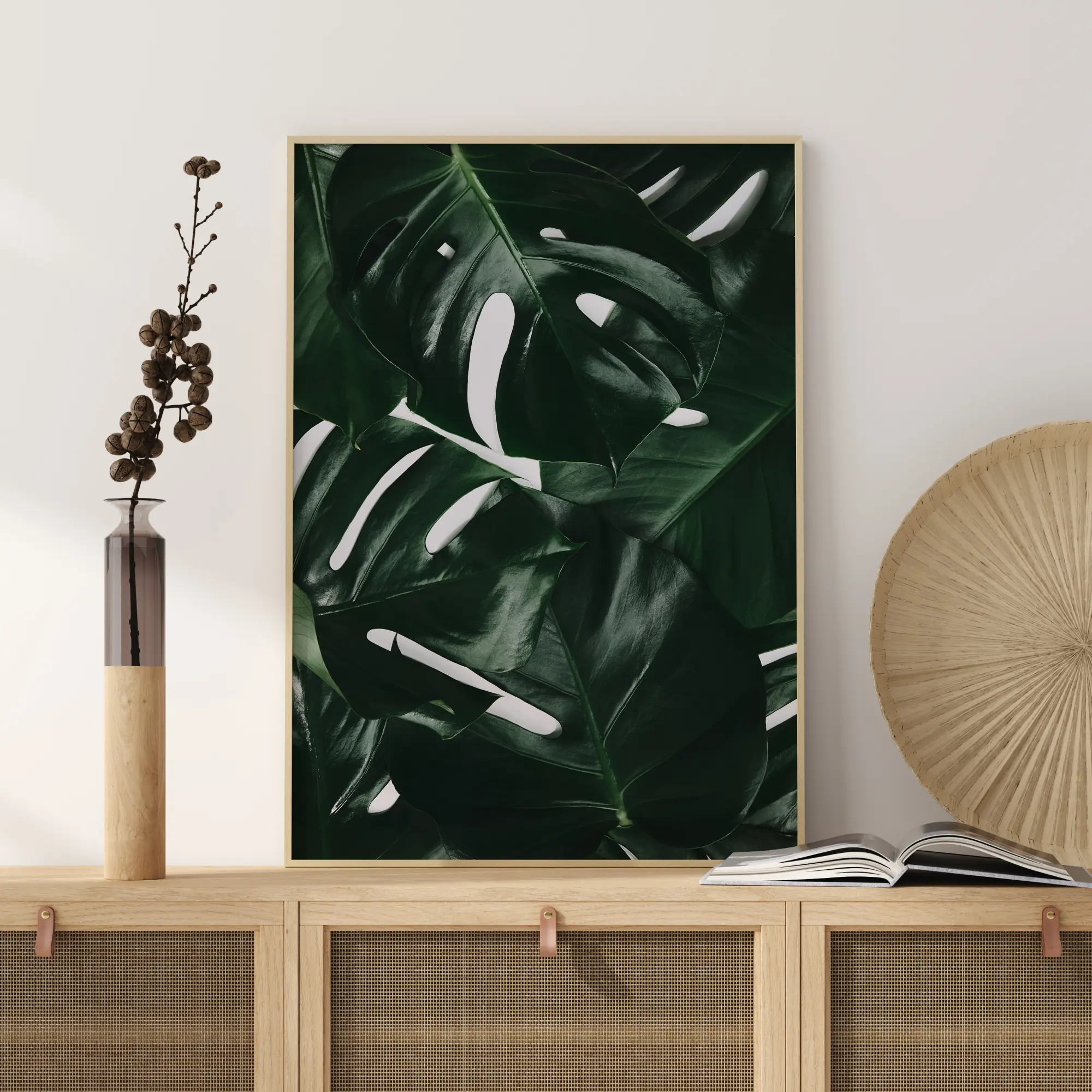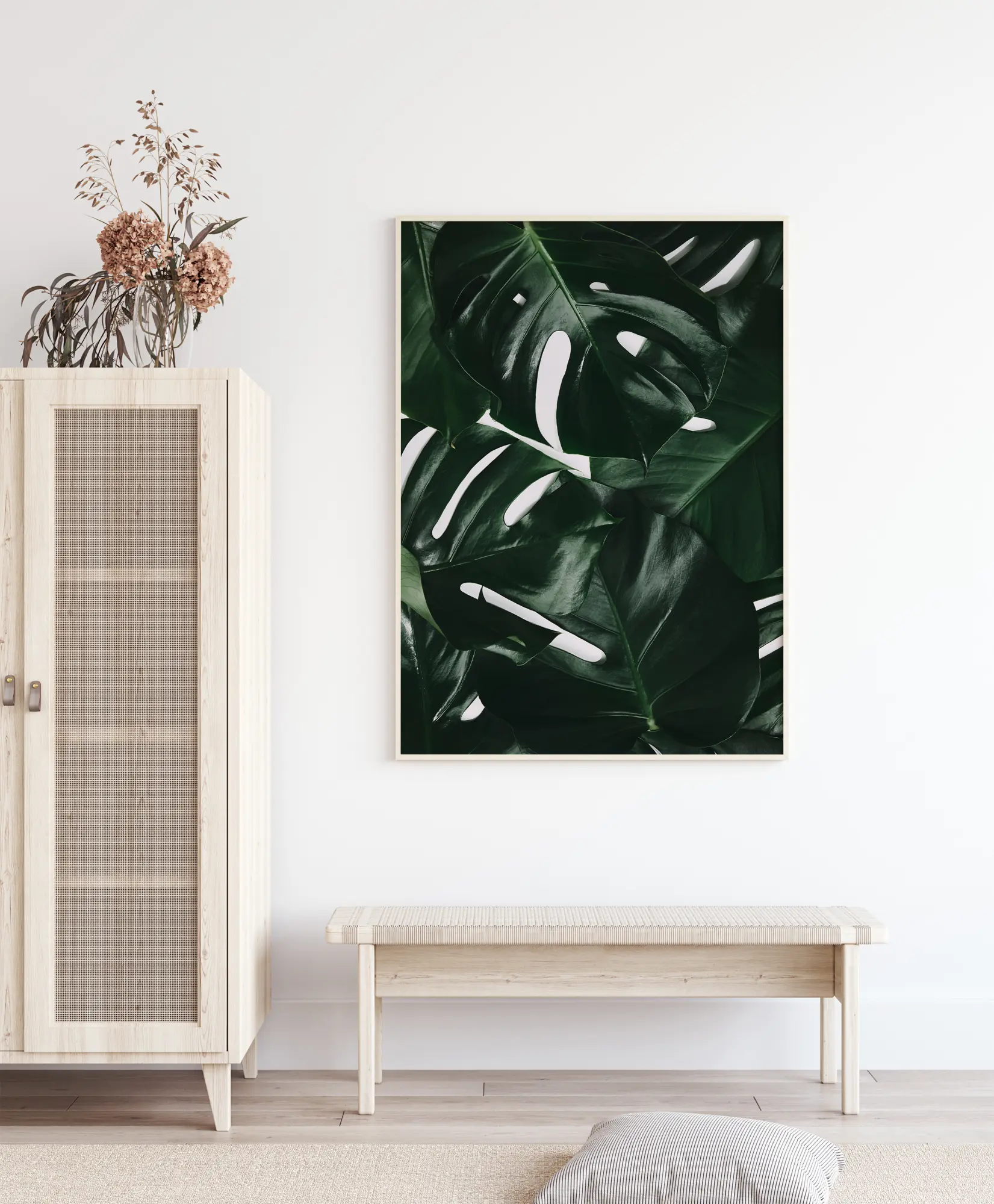 Une affiche saisissante en gros plan de feuilles de Monstera sur une surface blanche. Les feuilles de Monstera en forme de scie, sont huileuses et scintillantes. Les rayons du fond brillent à travers certains espaces. Parfait pour apporter un peu d’excitation au mur de votre chambre.