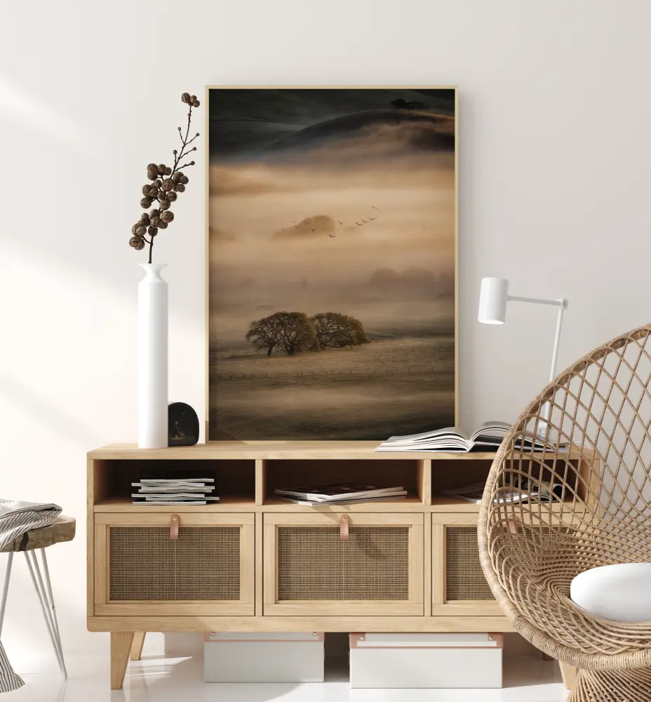 Une affiche envoûtante d'un matin brumeux à flanc de colline avec des oiseaux bravant magnifiquement le nuage jaune. Les doux tons bruns de l'impression créent une atmosphère relaxante où vous pouvez presque sentir la fraîcheur de la nature. Apportez la beauté de la nature dans votre maison avec ce pays des merveilles au petit matin.