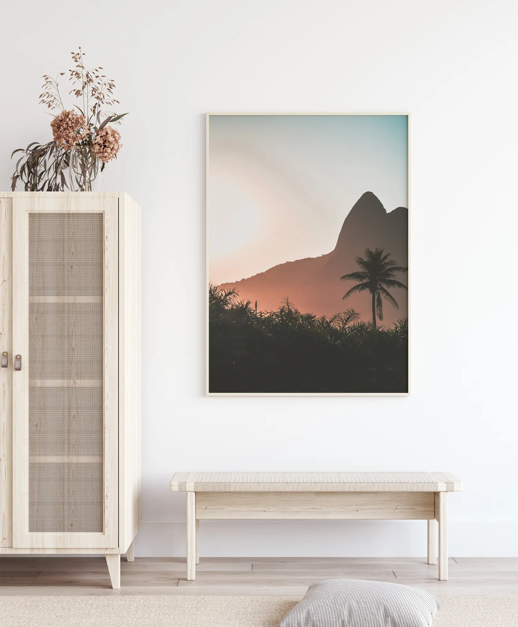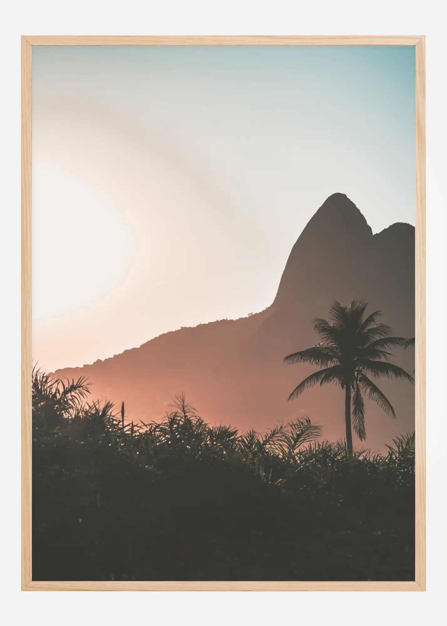 Une photographie étonnante d'une chaîne de montagnes au coucher du soleil. Le magnifique ciel bleu pâle met en valeur un palmier solitaire entouré de plus petits arbres au premier plan. Le soleil forme des rayons orange prêts à réchauffer votre maison. Une affiche parfaite à accrocher sur un mur monochrome.