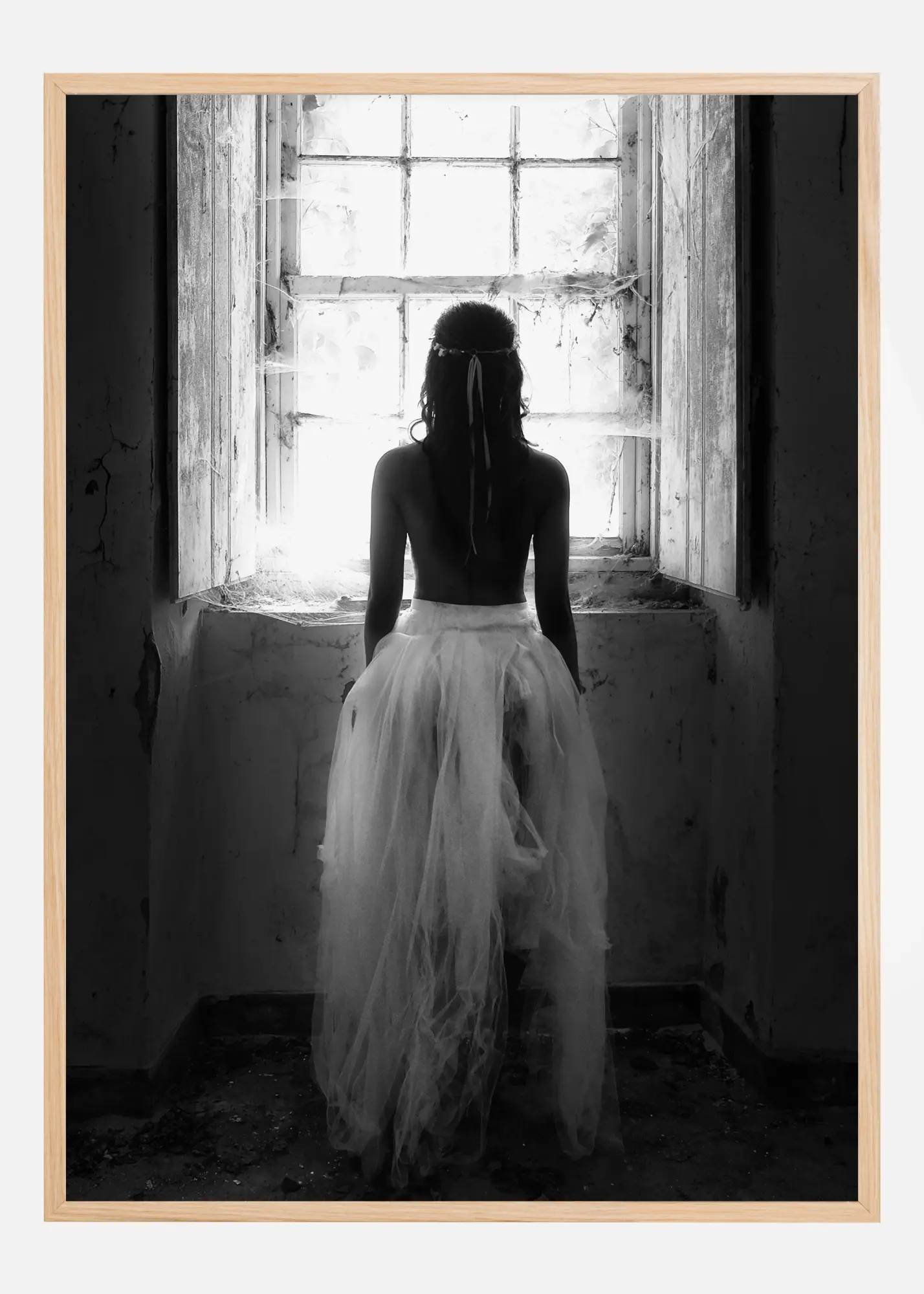 Une belle photo en noir et blanc d'une femme à moitié nue faisant face à une vieille fenêtre. La fenêtre sale est couverte de toiles d'araignée et la femme regarde par la fenêtre. Vêtue d'une jupe en tulle blanc, la jeune femme semble plongée dans ses pensées. Une affiche délicate à accrocher dans une chambre à coucher.