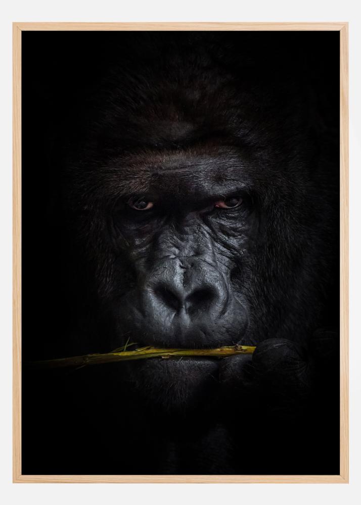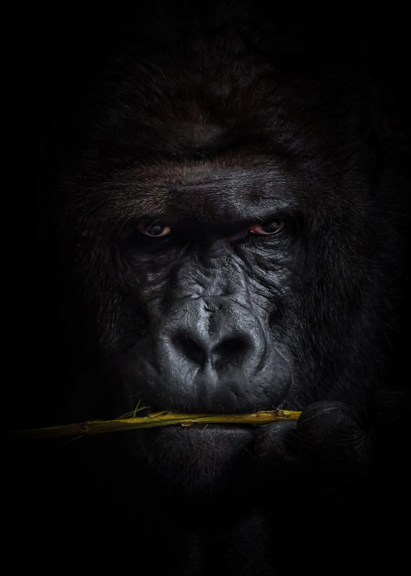 Un portrait rapproché d'un gorille qui mâche l'écorce d'une branche. Le regard est dirigé vers le photographe et la fourrure sombre se fond dans le fond noir, créant une belle profondeur au sujet. Un poster puissant avec une rencontre intime avec l'un des plus grands primates de la forêt tropicale.