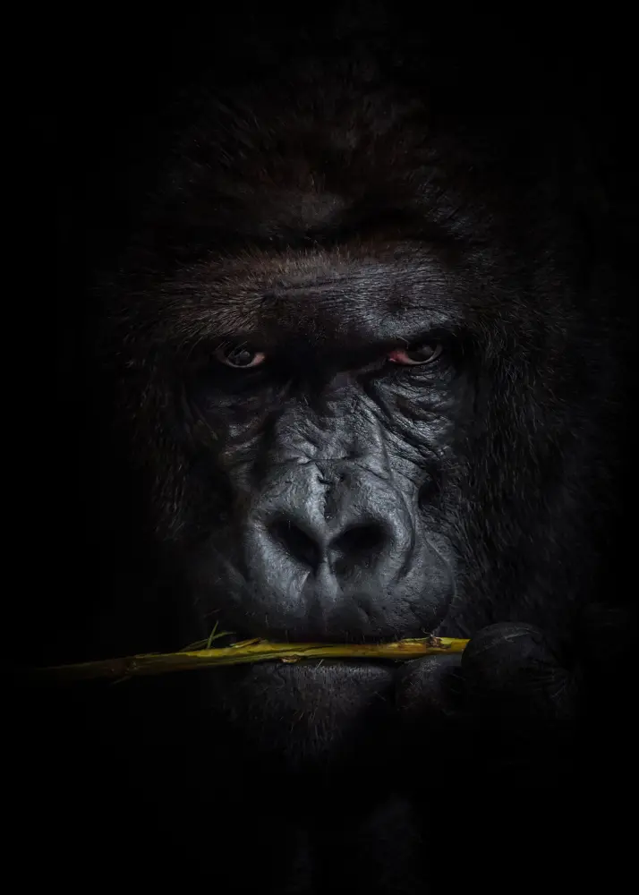Un portrait rapproché d'un gorille qui mâche l'écorce d'une branche. Le regard est dirigé vers le photographe et le pelage sombre se fond dans le fond noir, créant une profondeur merveilleuse au sujet. Un poster puissant avec une rencontre intime avec l'un des plus grands primates de la forêt tropicale.