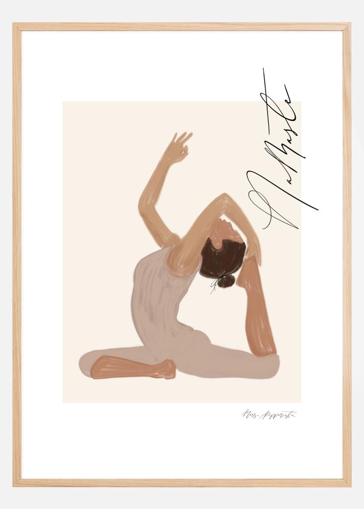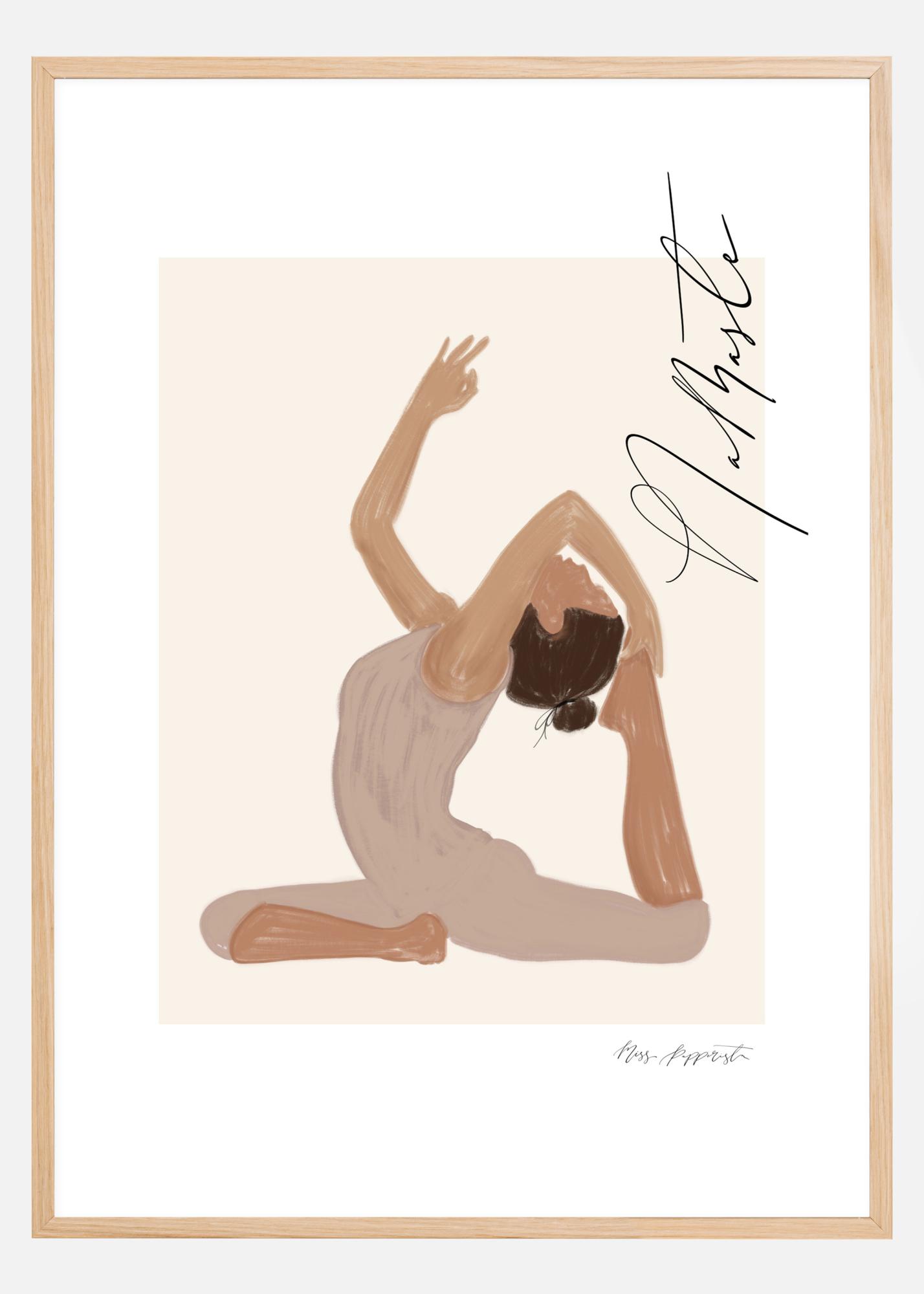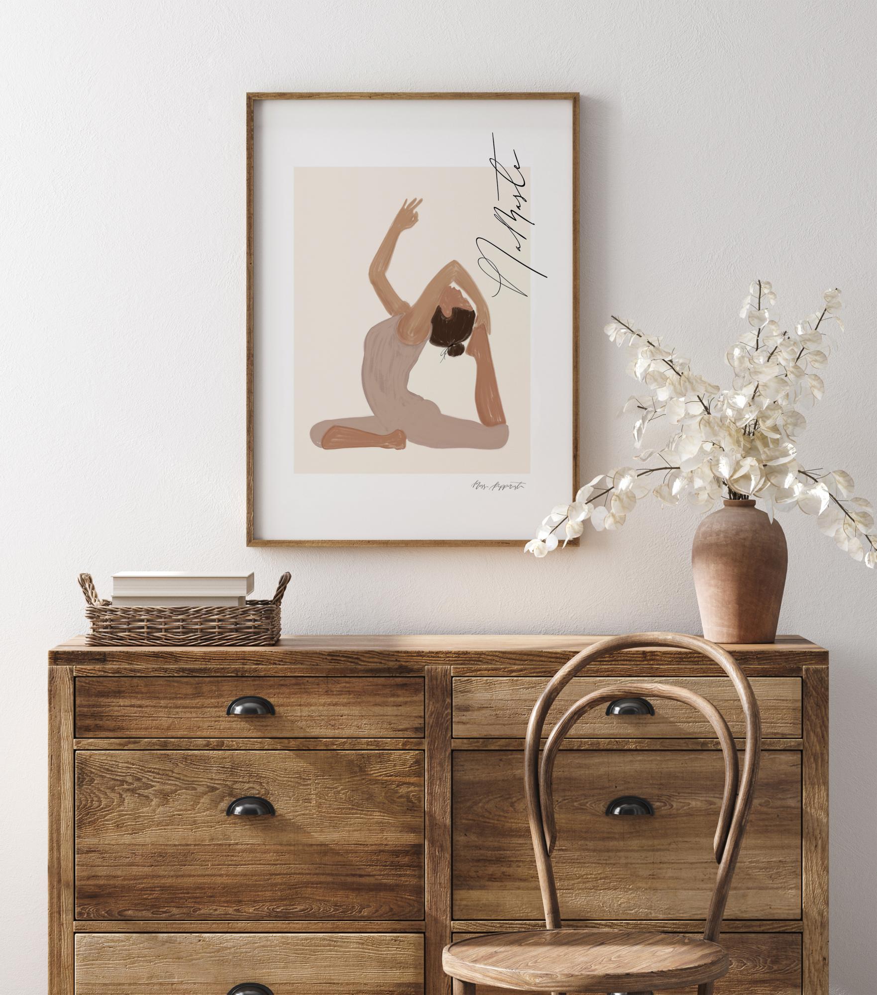 Un poster graphique en douces pastelles, représentant une femme dans une posture de yoga accompagnée du message "Namaste" (Je m'incline devant toi) en belle calligraphie. Un motif harmonieux et paisible encadré et mis en valeur par un passe-partout blanc plus large, créé par Jenny Skantz, Miss Papperista.