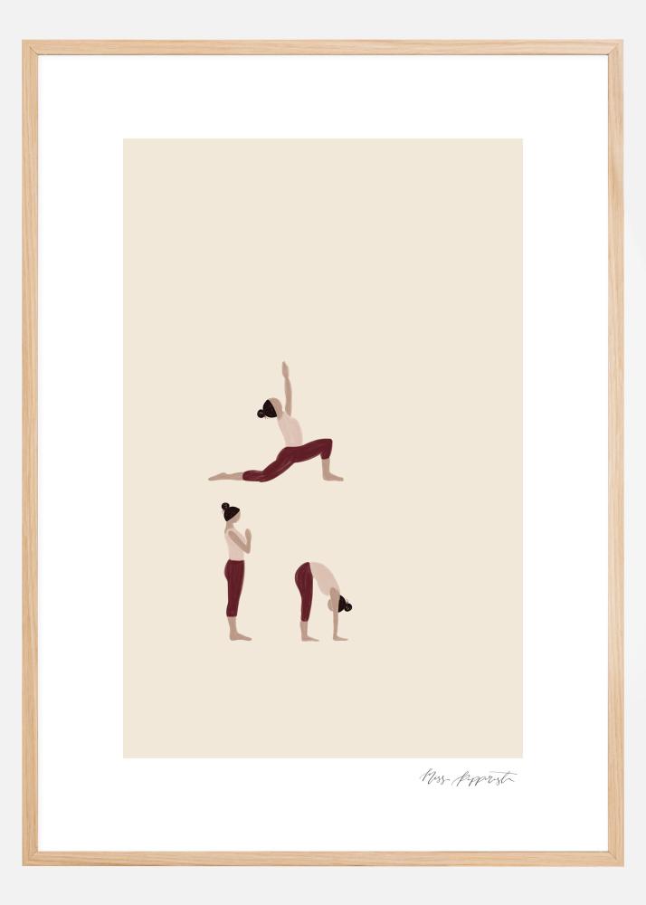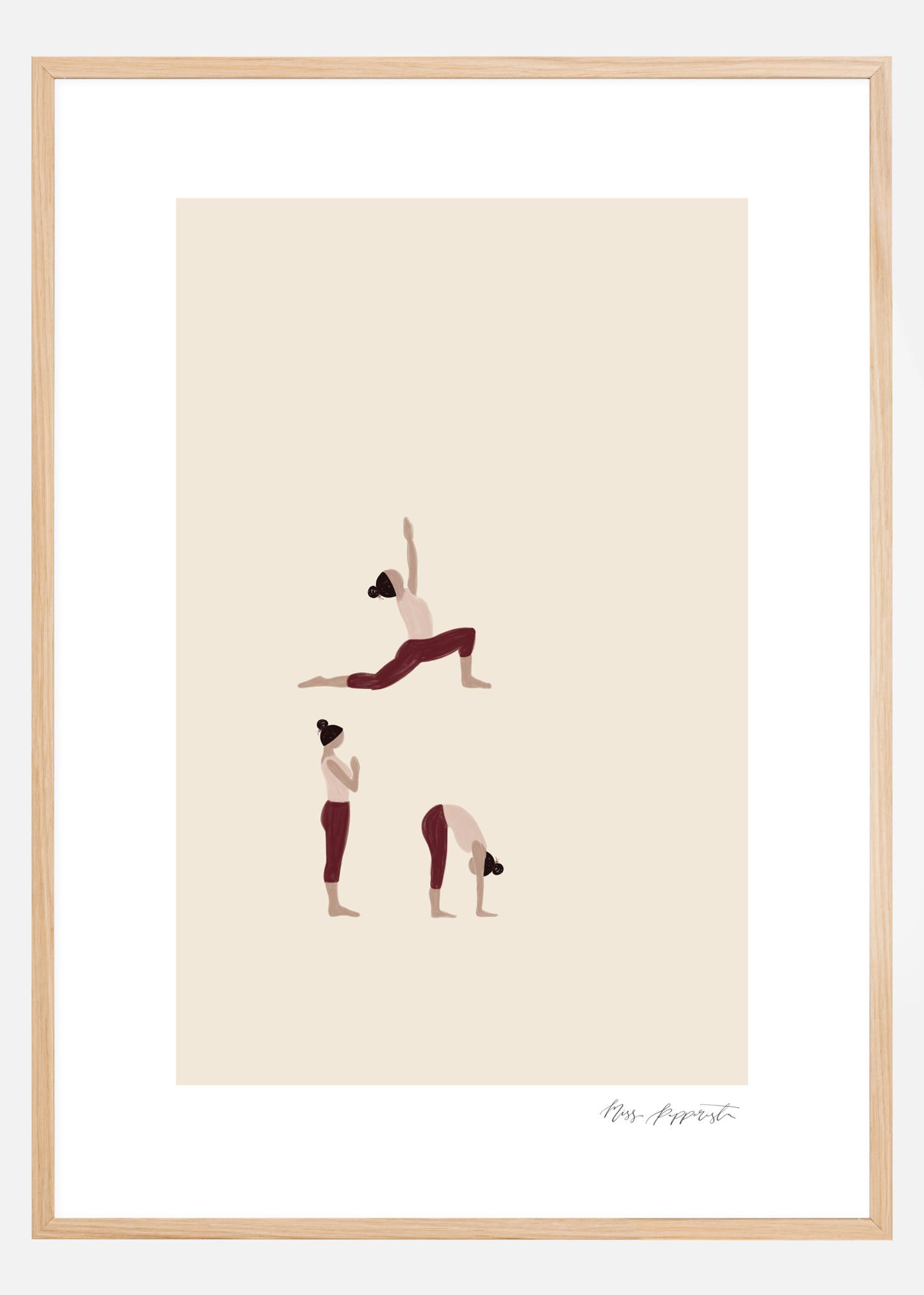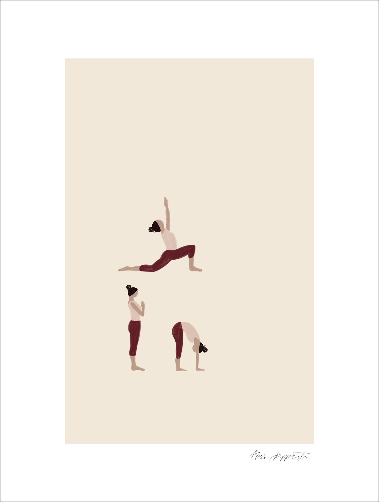 Une œuvre d'art représentant une femme pratiquant le yoga. Sur une surface de couleur crème, la femme est dans trois poses debout différentes. Toutes les poses sont parfaitement exécutées. Une affiche parfaite à accrocher dans une école de yoga ou une salle de sport.
