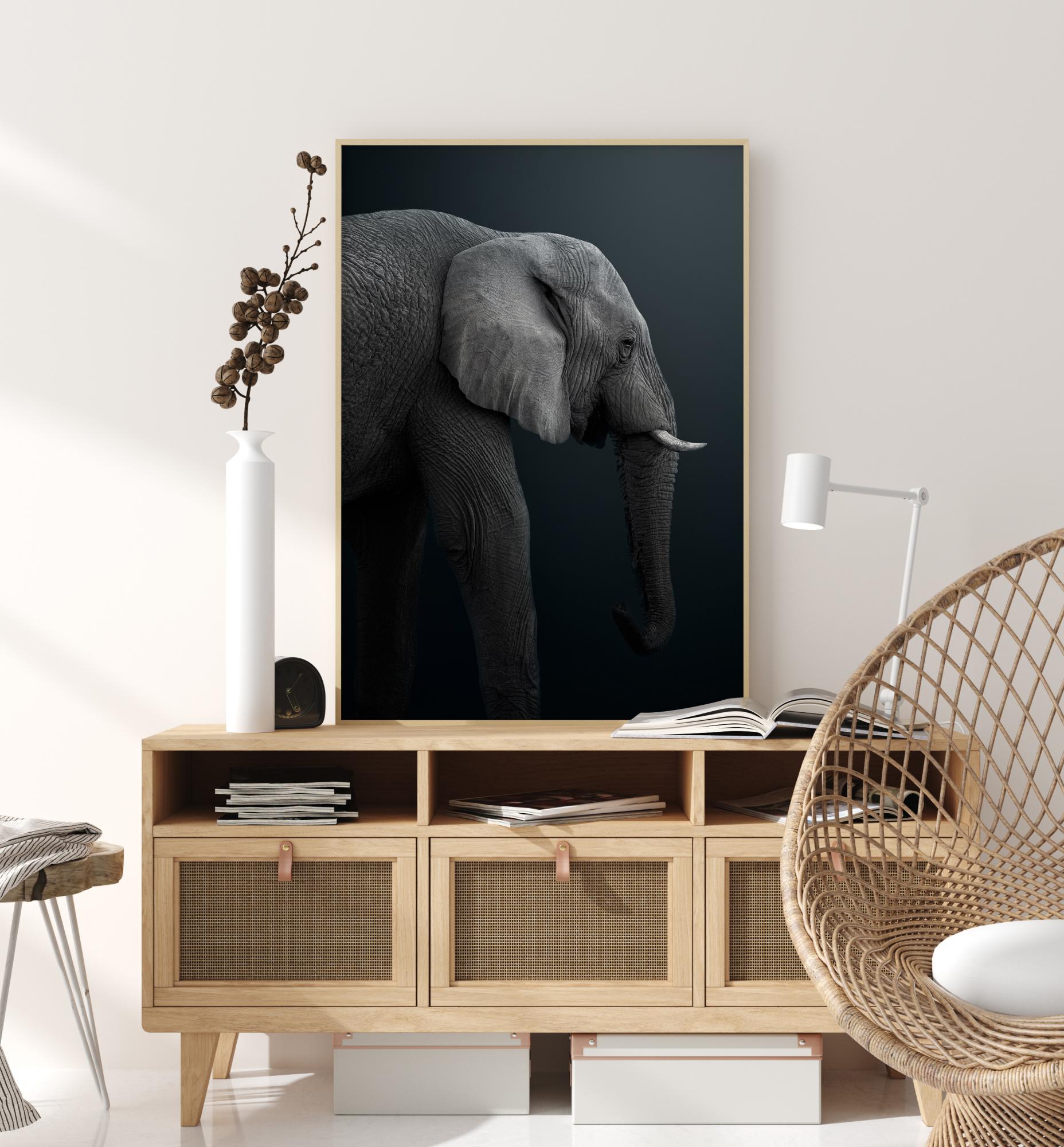Un adorable portrait d'un éléphant de Namibie en bonne santé. Le géant gris est tourné vers la droite, sa trompe pendante. Le fond bleu foncé crée un sentiment de tristesse car l'éléphant semble très seul. Une belle affiche pour tous les amoureux.