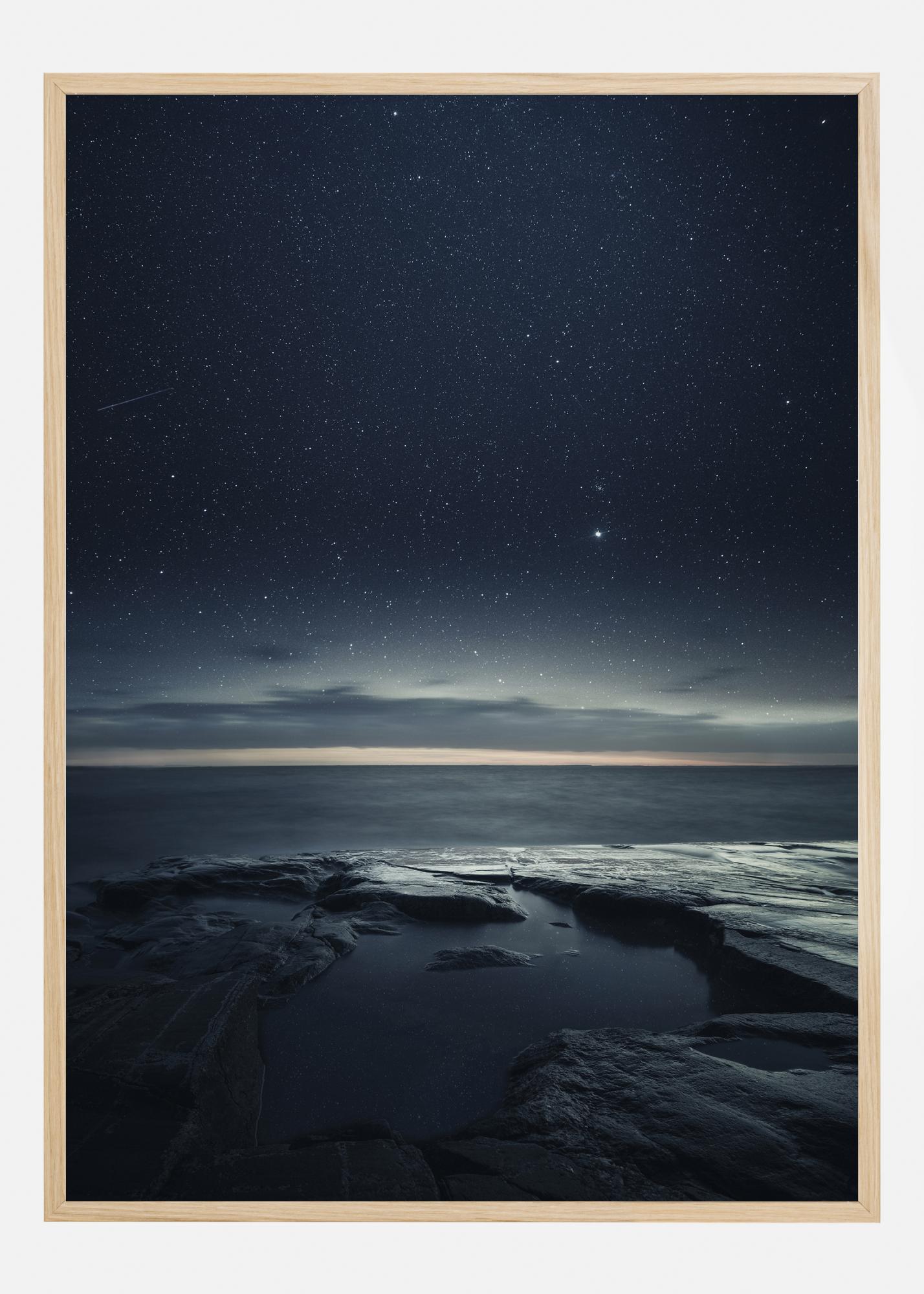 Une affiche étonnante de rivage rocheux avec de l'eau reflétant le ciel violet et ses étoiles scintillantes. L'horizon est clairement visible grâce à un rayon de lumière blanche qui s'étend sur la mer. C'est une image rare de la magie du soir, prête à faire vibrer votre maison.