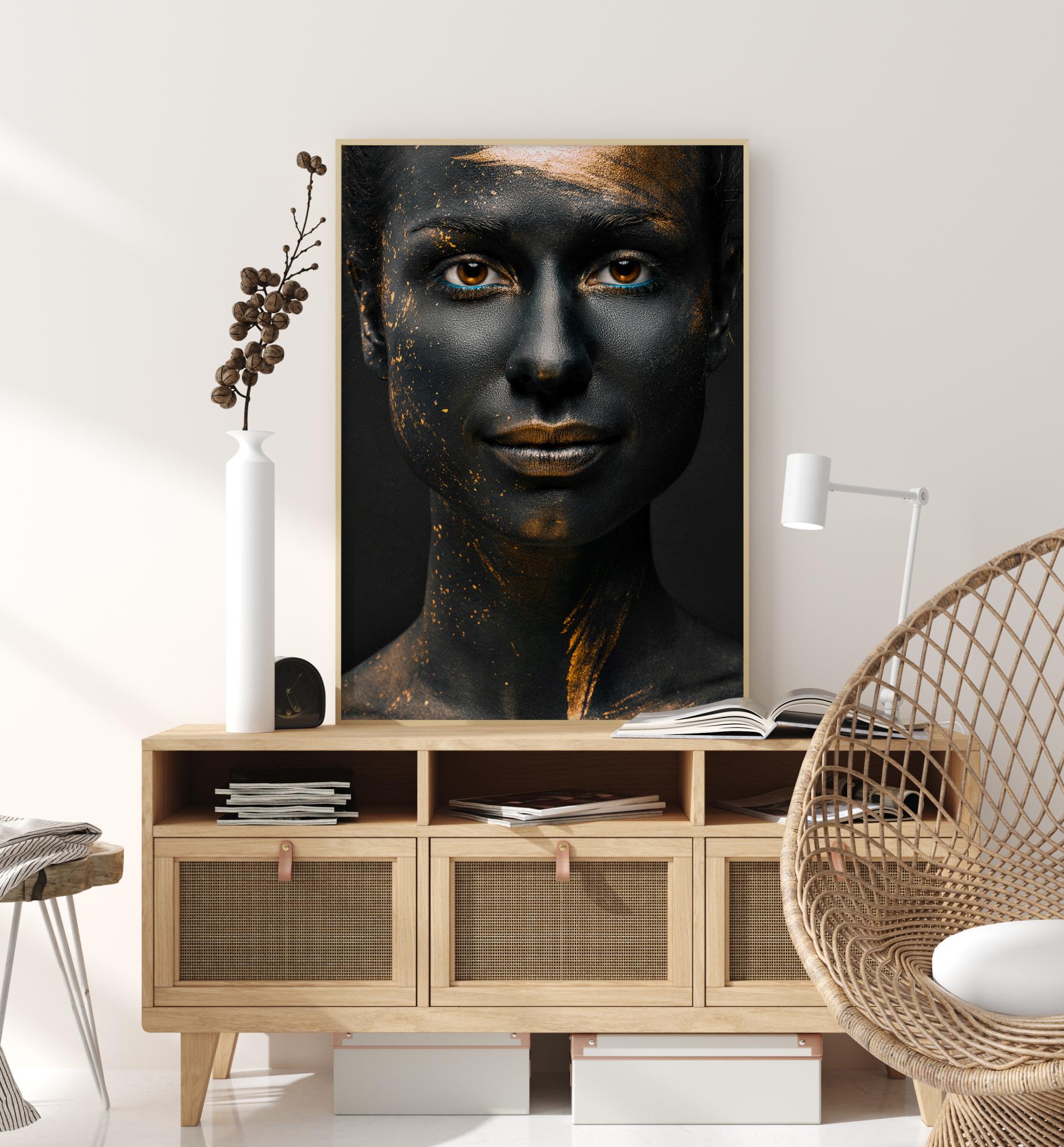 Portrait noir sur noir d'une dame souriante au visage peint en gris. Le visage de la femme a été éclaboussé de peinture dorée sur son front, ses lèvres et son cou. Regardant droit dans l'appareil photo, ses yeux ont été soulignés avec de l'eye-liner bleu créant un regard intense. Cette magnifique affiche présente une image de beauté parfaite qui illuminera votre maison.