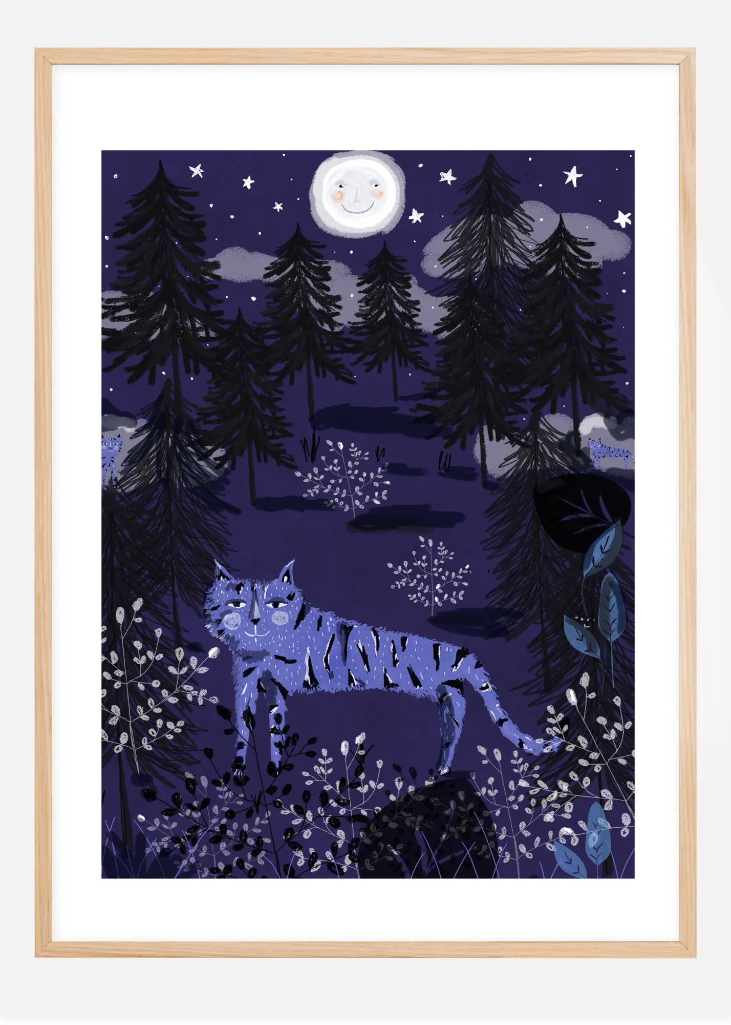 Une affiche amusante d'une forêt la nuit avec une lune et un tigre souriants. Le ciel violet est rempli de nuages et d'étoiles scintillantes. À l'arrière-plan, les pins se tiennent debout tandis que la lune les contemple. Les mauves et les verts foncés créent un sentiment de chaleur, tandis que les petits buissons blancs ajoutent un peu de lumière supplémentaire à l'impression. Un poster parfait pour la chambre de votre enfant.