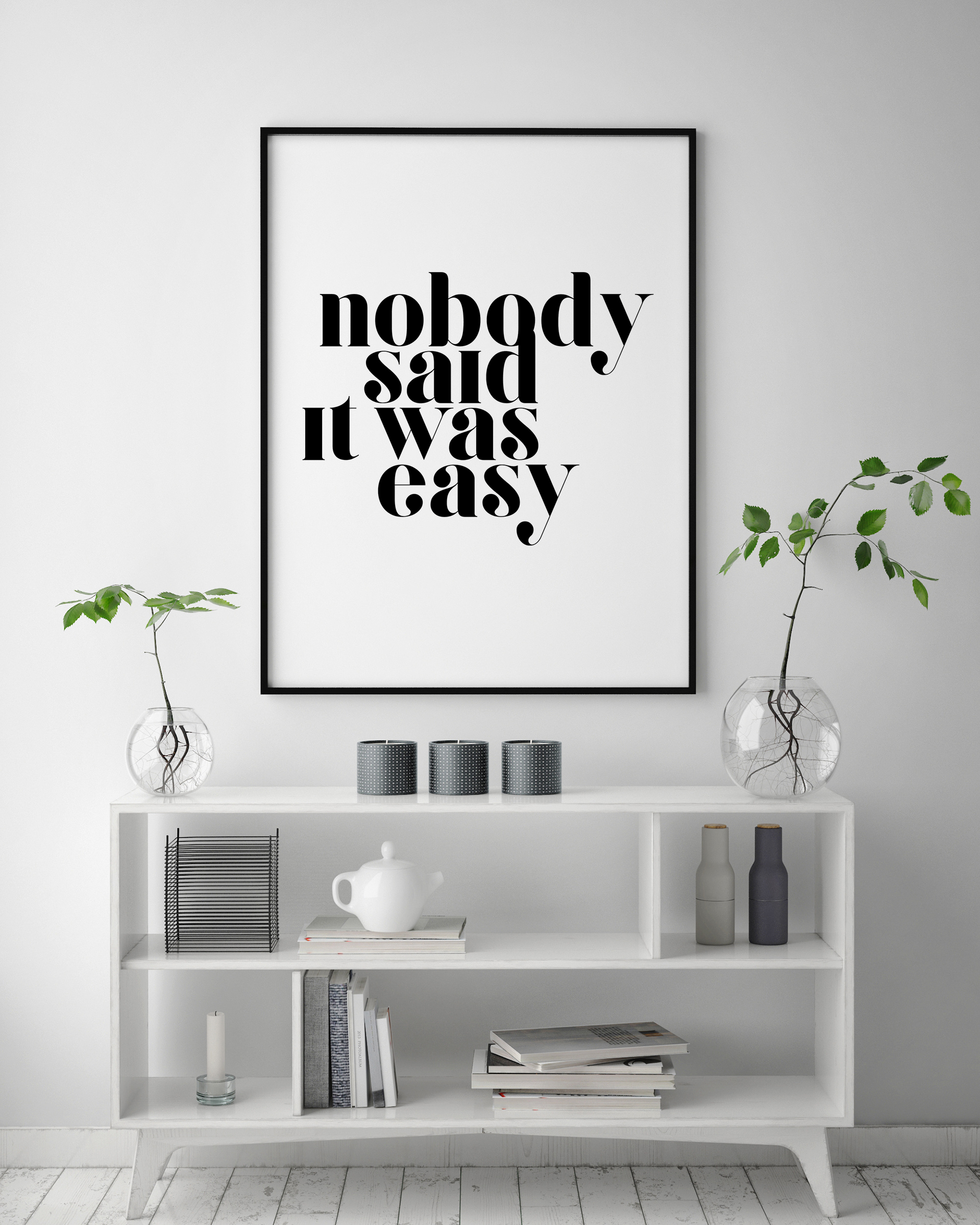 Une affiche imprimée d'une citation "personne n'a dit que c'était facile". Inscrire sur une toile blanche, la phrase en une police noire et gras est un message d'encouragement simple mais efficace. Un poster parfait à accrocher dans un environnement de travail.