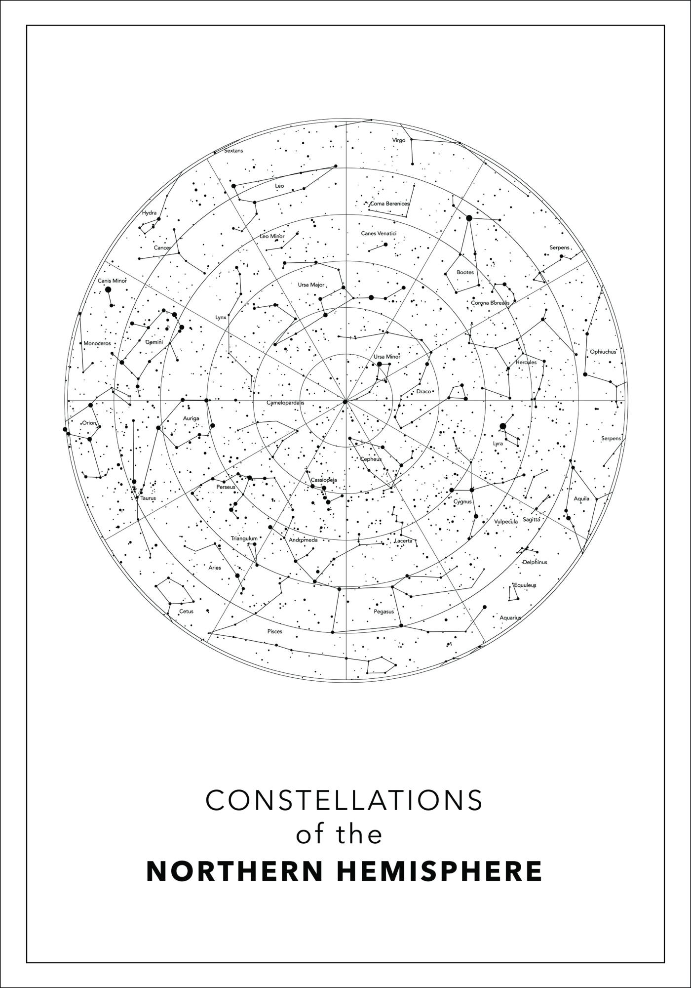 Une charmante carte circulaire des constellations de l'hémisphère nord. Sur un fond blanc, les longitudes et les latitudes ont été soulignées en noir et le nom de chaque constellation est écrit sous chacune d'elles. Cette affiche délicieuse est parfaite pour une bibliothèque ou un bureau.