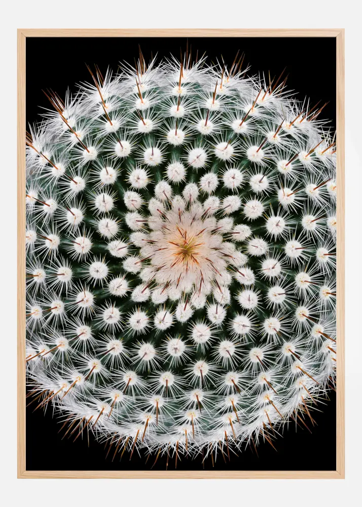 Une affiche de vue aérienne d'un cactus avec des fleurs blanches. Sur un fond noir, le vert foncé met en valeur les fleurs blanches et les épines. La partie centrale de la plante a une touche légèrement jaune, ce qui ajoute un peu de couleur à l'impression. Un poster idéal pour tous ceux qui aiment les plantes.