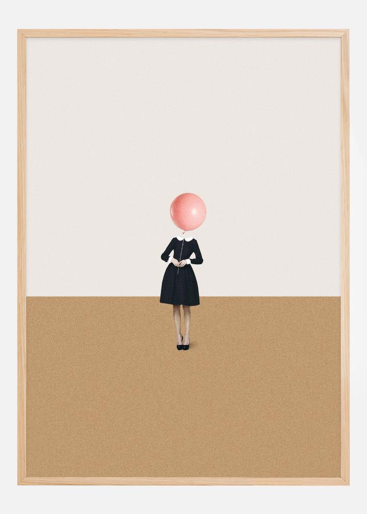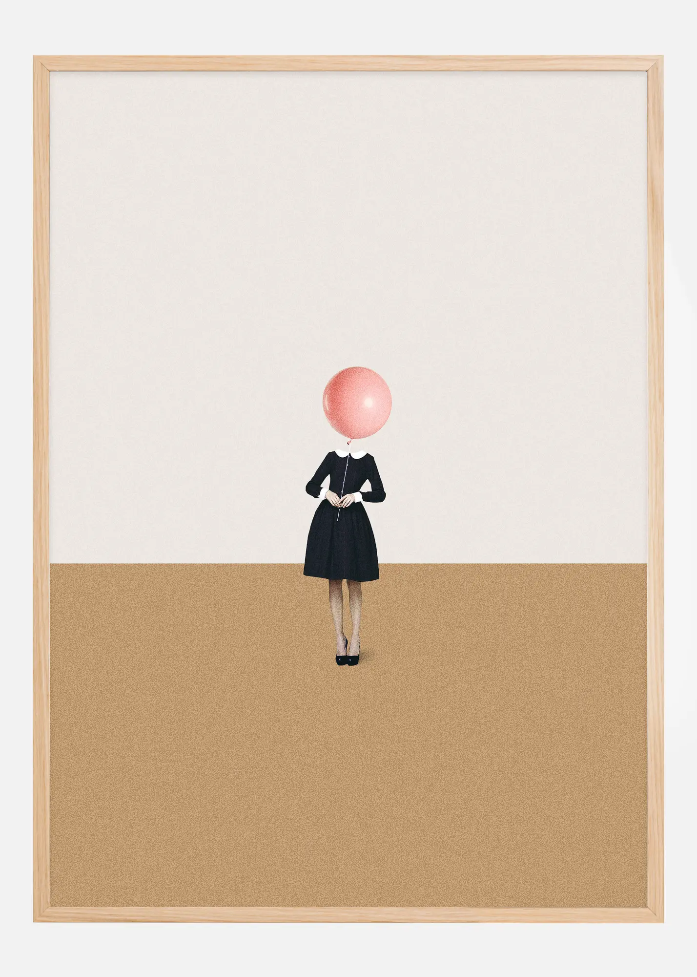 Cette affiche artistique attire le regard avec son image simple mais puissante d'une femme vêtue d'une robe noire, se tenant seule sur un fond de tons sableux chauds. Elle tient ce qui semble être une bulle rose parfaitement sphérique au-dessus de sa tête, créant un contraste visuel et réfléchi entre la personne et la surface environnante.