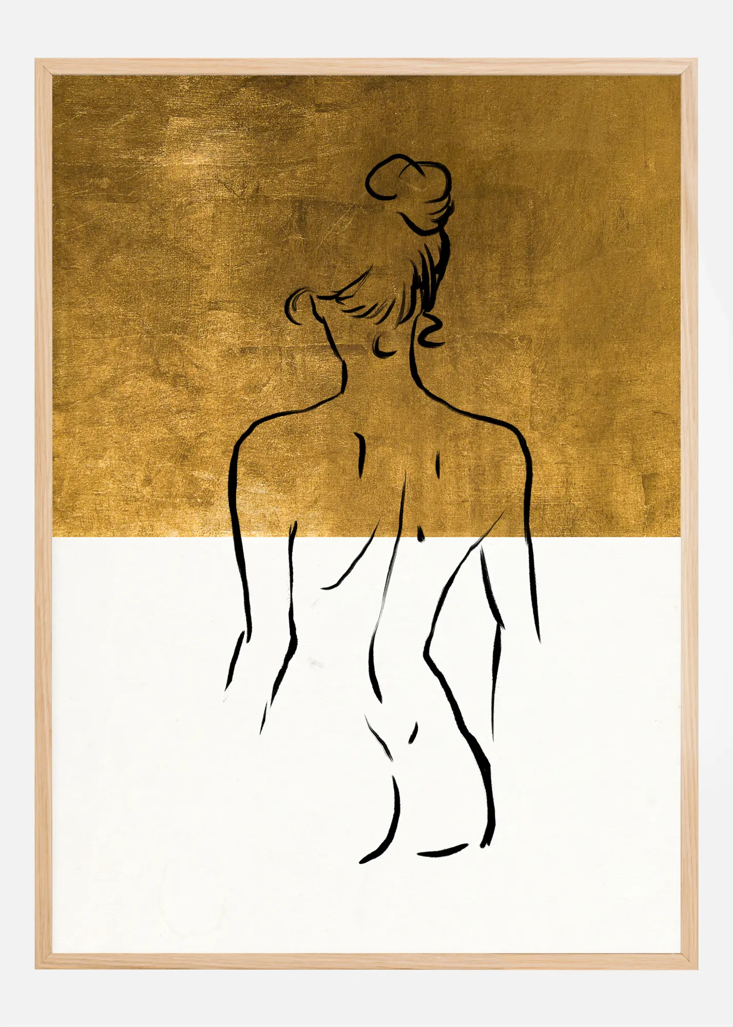 Ce poster élégant capture l'essence de la beauté et de la force féminine à travers une illustration élégante. L'œuvre d'art se compose d'une silhouette féminine esquissée avec des lignes noires audacieuses sur un fond doré qui se distingue du blanc par une ligne horizontale nette. Elle combine un sentiment de grâce sculpturale classique avec un minimalisme moderne et offre une déclaration puissante mais subtile pour tous les espaces.