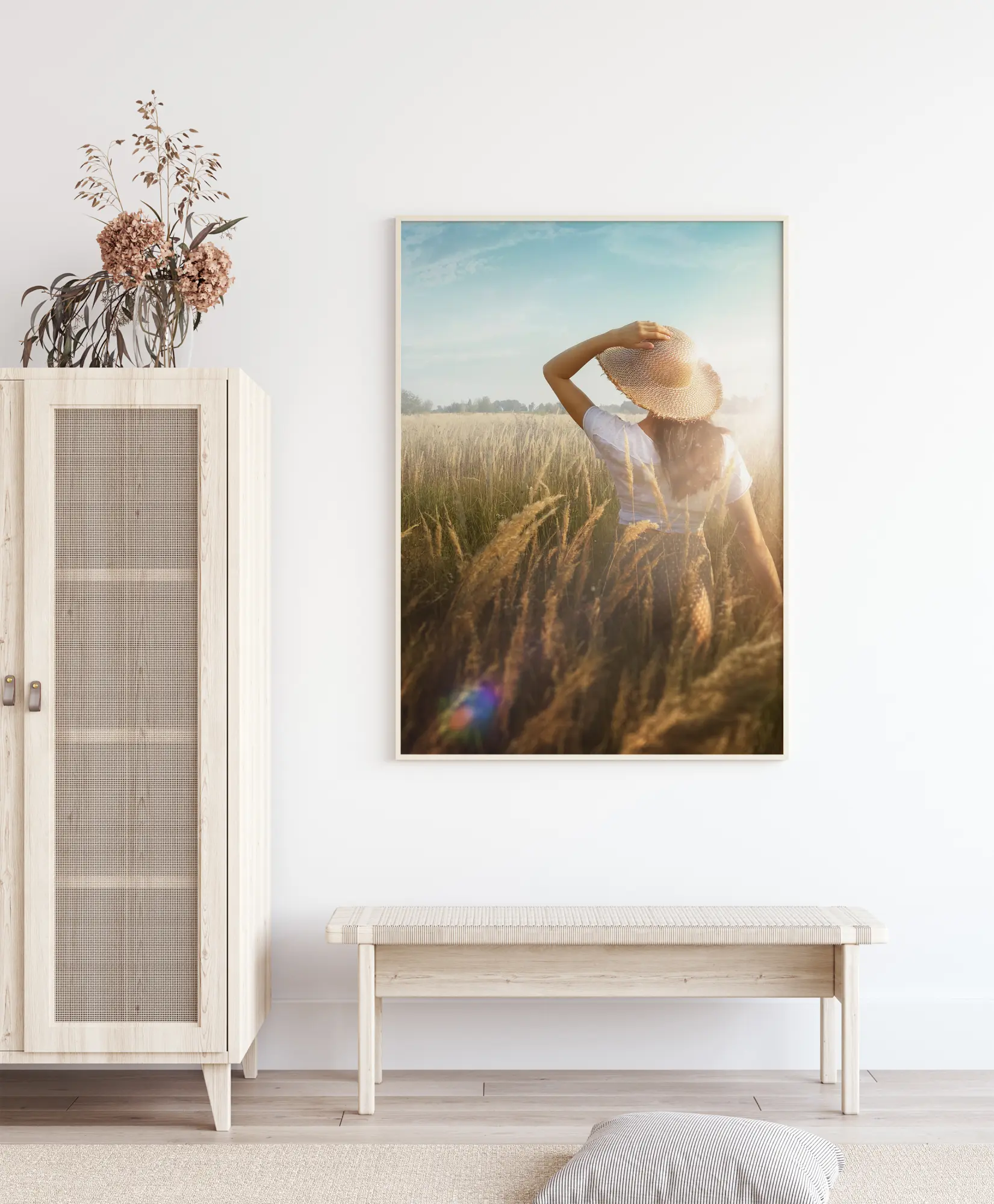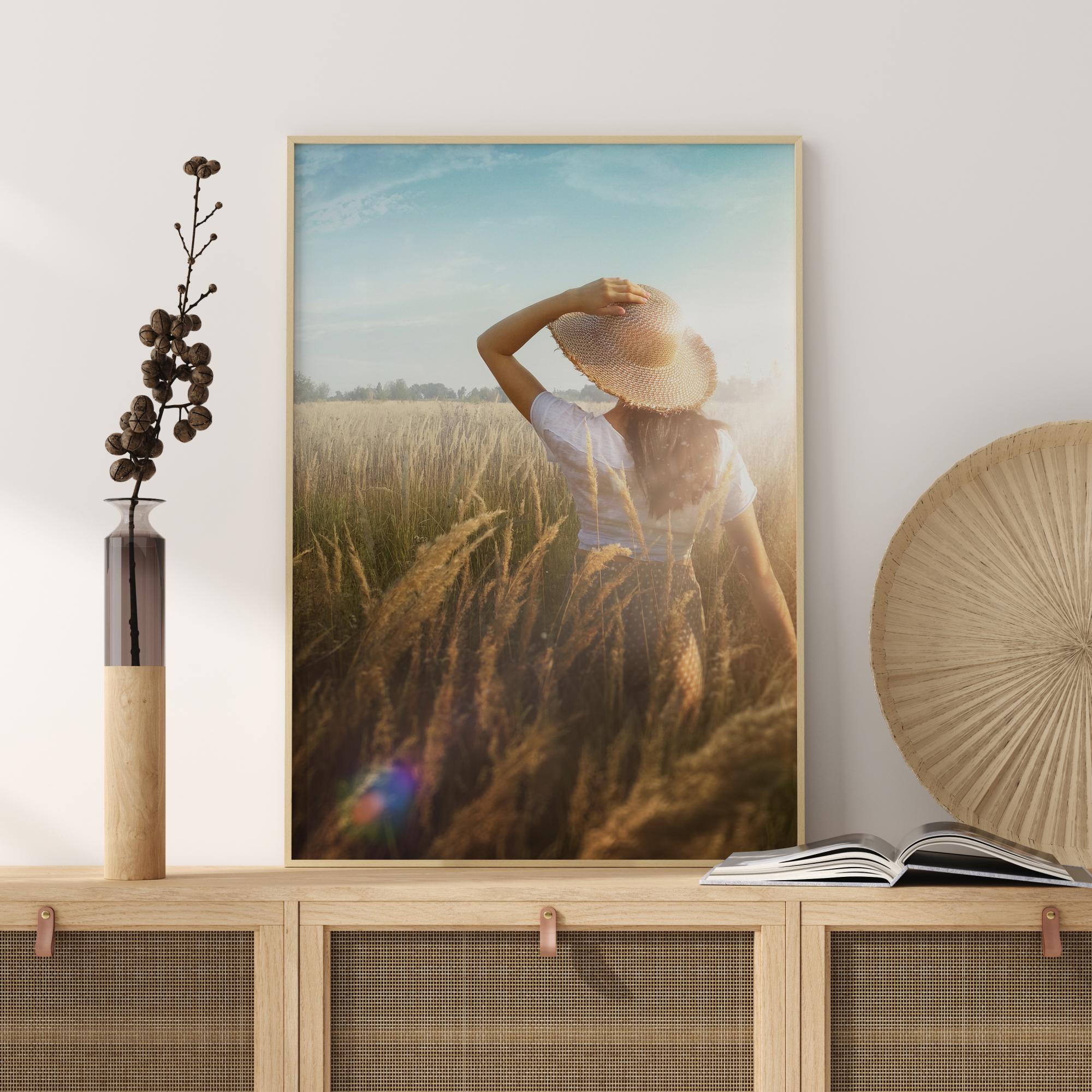 Une impression relaxante et fraîche d'une femme avec un chapeau de paille dans les champs de blé. Le magnifique ciel bleu rencontre le champ de blé doré. La main posée sur la tête, la jeune femme se promène dans les champs en profitant de l'air frais. Une affiche idéale pour tous ceux qui apprécient la beauté de la nature.