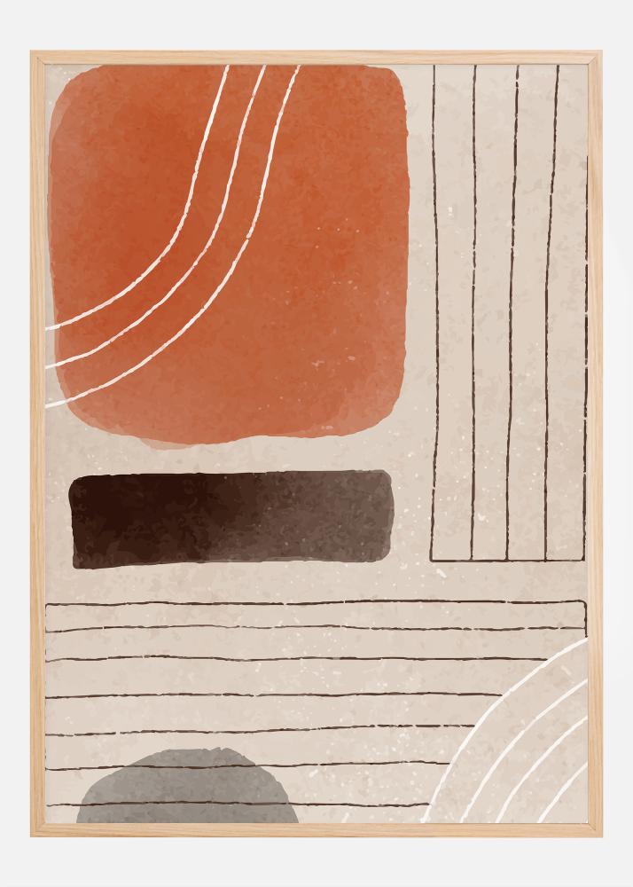 Cette affiche artistique joue sur l'abstraction et la géométrie, et évoque un sentiment plus profond de réflexion. Dans le motif, on trouve un grand carré de terre cuite riche et rempli qui ancre le design, bordé de lignes blanches courbes qui donnent une impression de mouvement et de douceur. Cette couleur chaude et terreuse crée une sensation immédiate de chaleur et de bienvenue.