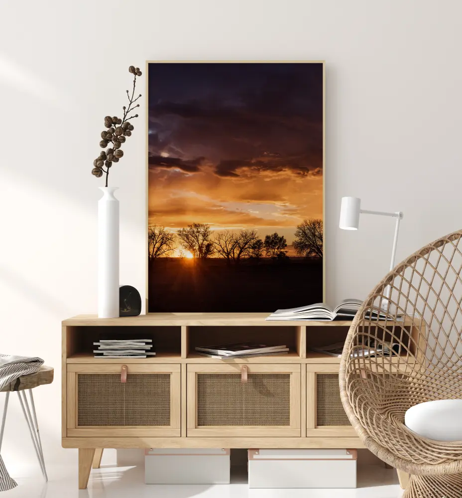 Une affiche époustouflante d'un coucher de soleil orange. Le coucher de soleil à l'horizon met en valeur les arbres d'automne dans les champs. Avec un ciel spectaculaire, les nuances d'orange créent une atmosphère chaleureuse et apaisante. Un poster étonnant pour apporter de la chaleur dans votre salon.