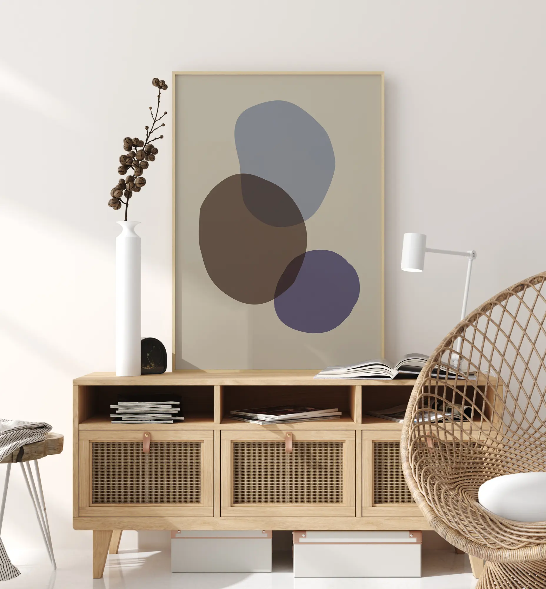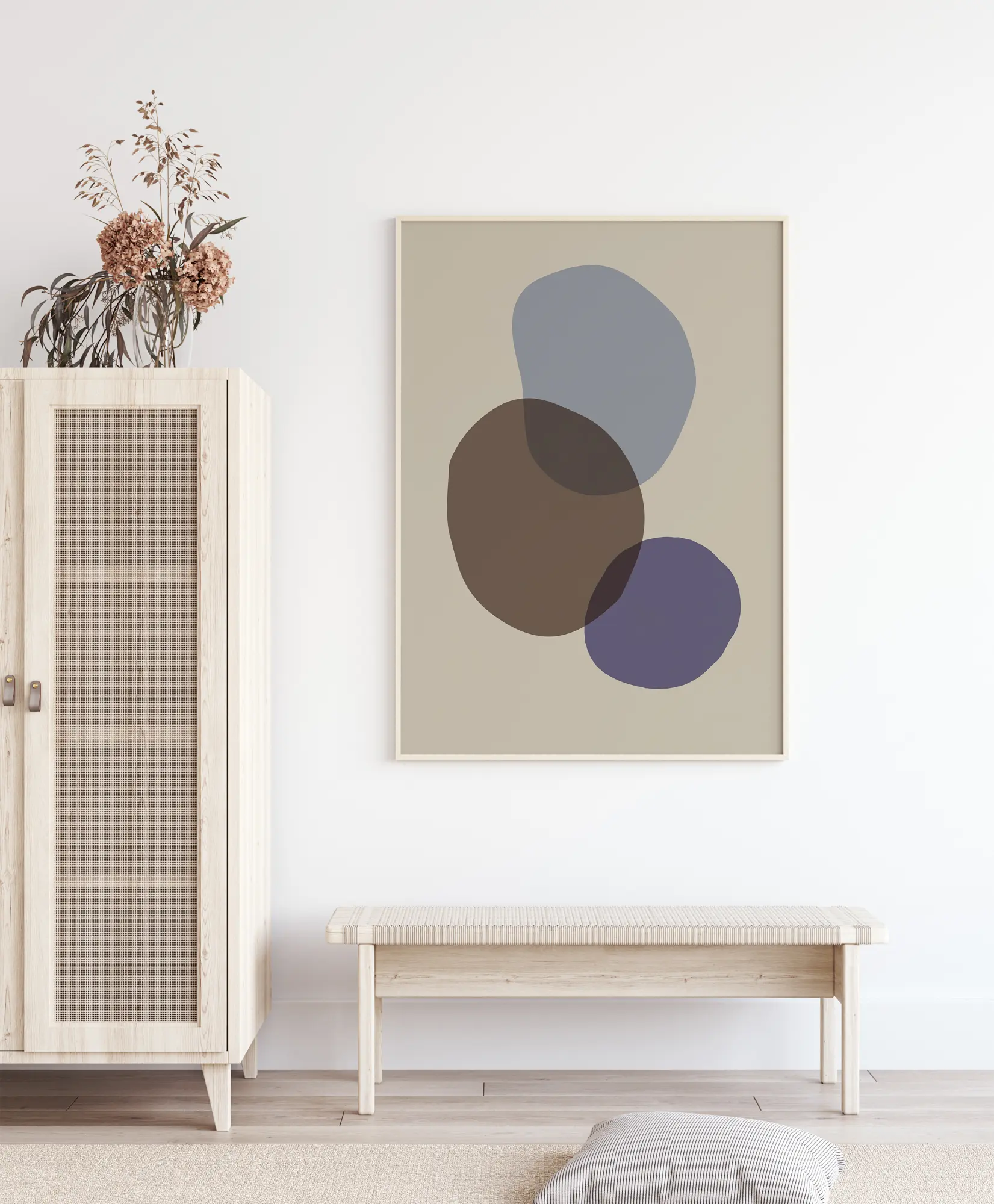 Une affiche fantaisie composée de trois formes de couleurs différentes. Sur un fond crème, les formes brunes, grises et mauves se chevauchent. La brune domine les petites formes mauves et grises. Une affiche simple à accrocher dans votre maison. Faites appel à votre imagination pour savoir ce que les formes représentent.