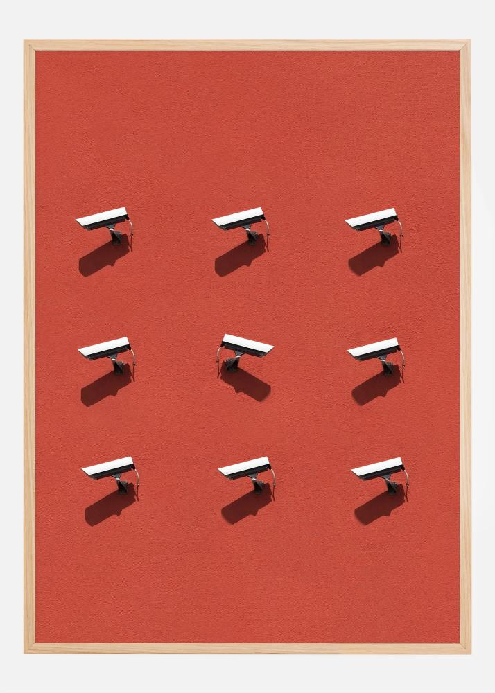 La teinte rouge profond du fond crée un contraste fort avec les caméras en noir et blanc, instillant un sentiment de vigilance et de gravité. Cette impression s'intègre parfaitement dans un intérieur moderne où l'art rencontre les questions de société, et elle constitue un sujet de conversation idéal pour un bureau, une salle d'étude ou un salon. Faites de cette affiche une partie de votre décoration et inspirez la discussion et la prise de conscience du monde dans lequel nous vivons.