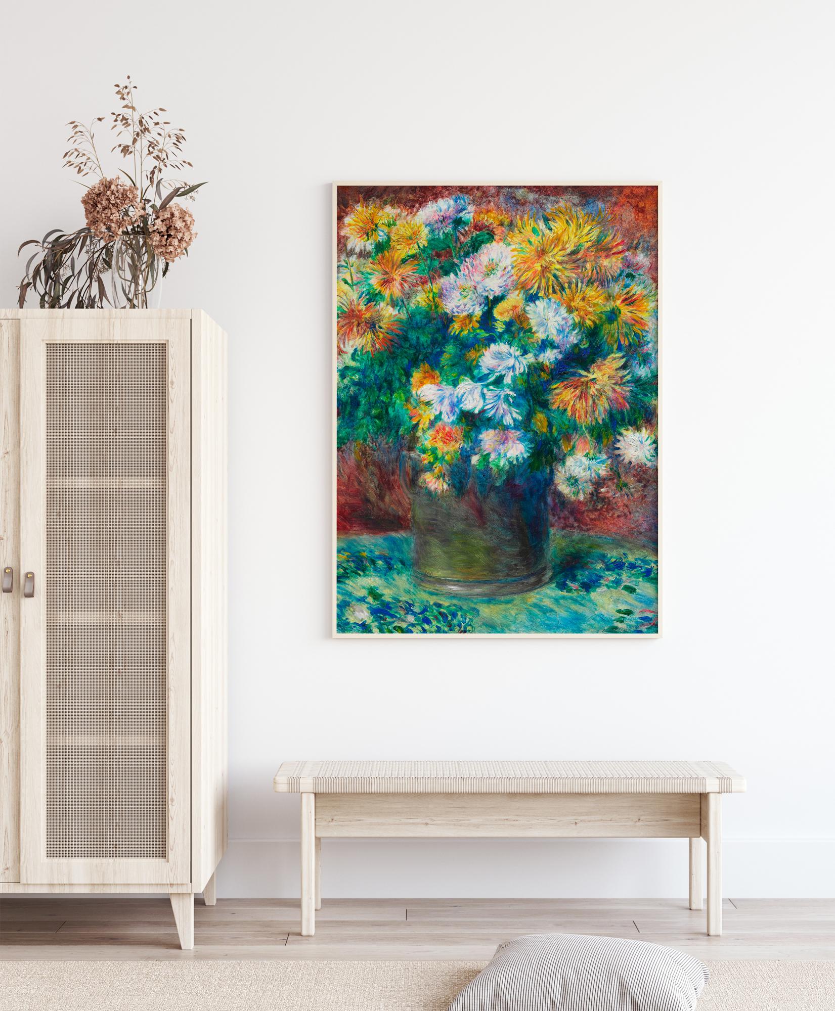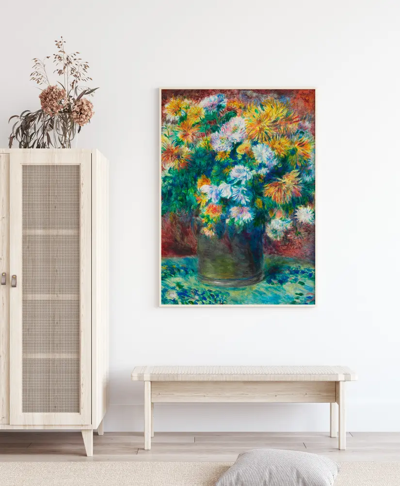 Une affiche peinte en couleurs d'un bouquet de fleurs. Sur un fond multicolore, cette belle palette de couleurs crée une atmosphère joyeuse. Les fleurs sont placées sur une nappe de couleur turquoise qui met en valeur toutes les couleurs vives de ce tirage. Un poster parfait pour tous ceux qui aiment les fleurs.