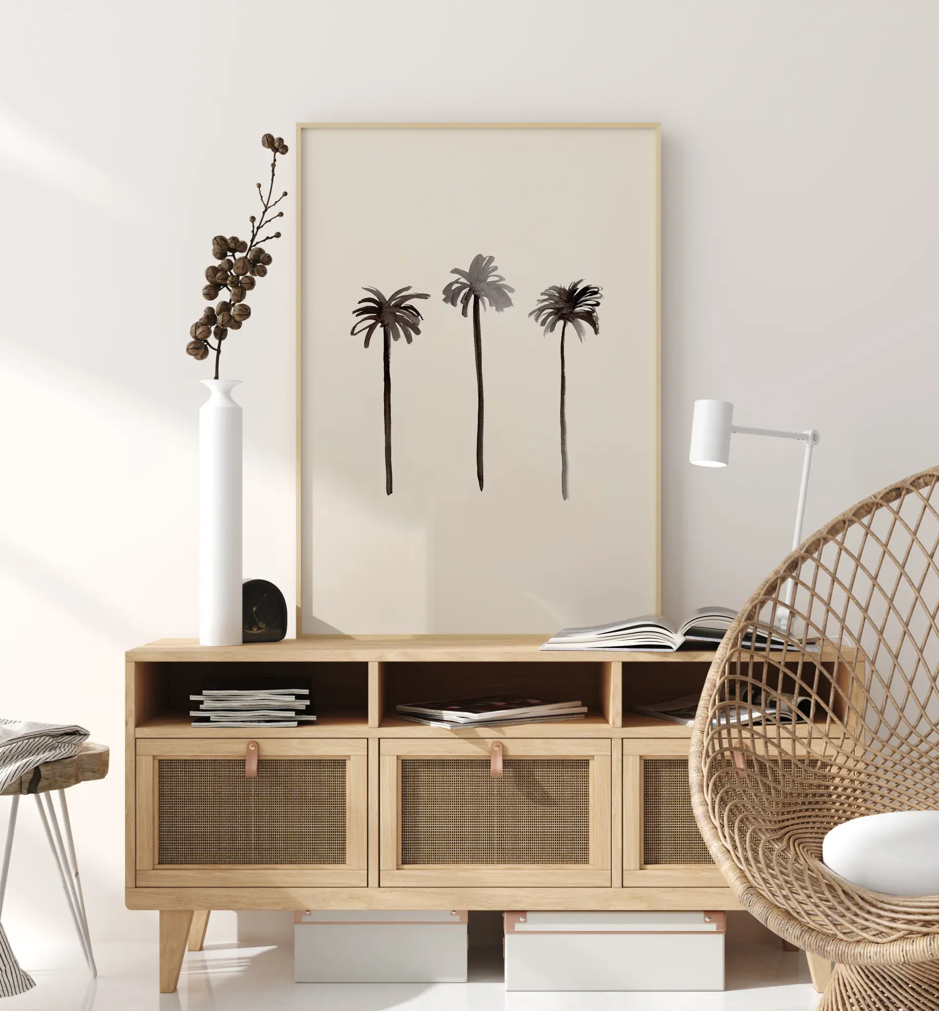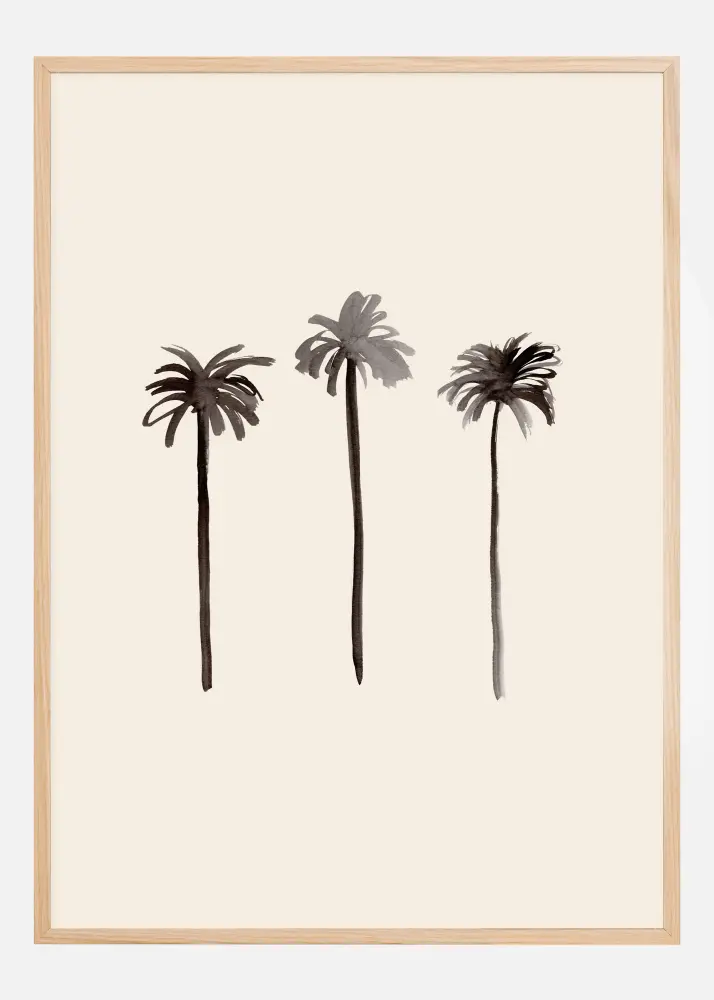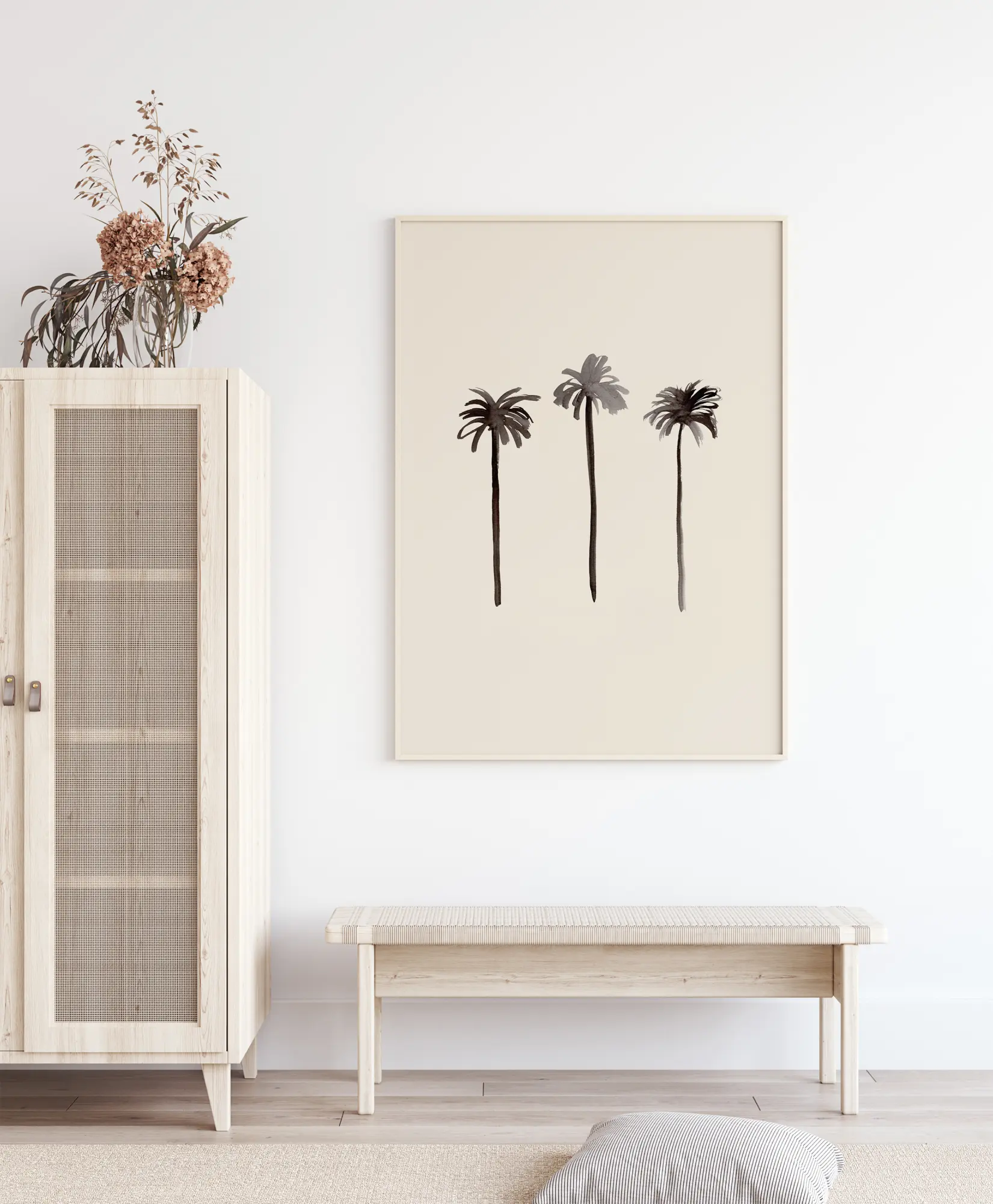 Une affiche simple en noir et blanc de trois palmiers alignés. Sur un fond beige, les différentes nuances de noir ont été utilisées pour créer l'obscurité sur les feuilles. Un simple poster à accrocher sur le mur de votre salon.