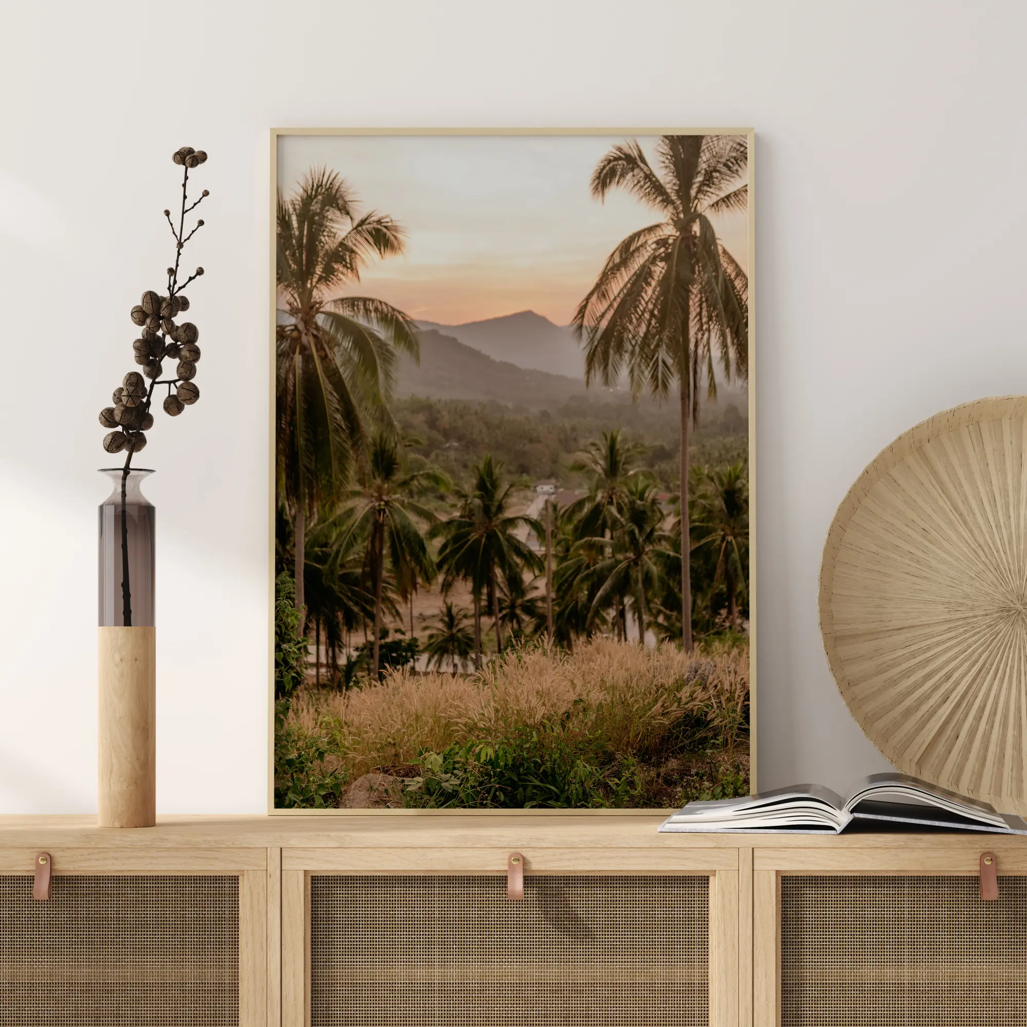 Une affiche rurale de palmiers sur un paysage de montagne. Avec le beau ciel orange au loin, ce vaste paysage rural est riche en végétation. Les magnifiques verts riches de l'impression créent un sentiment de chaleur et de silence. Entendez le silence de ce poster en l’accrochant dans votre salon.