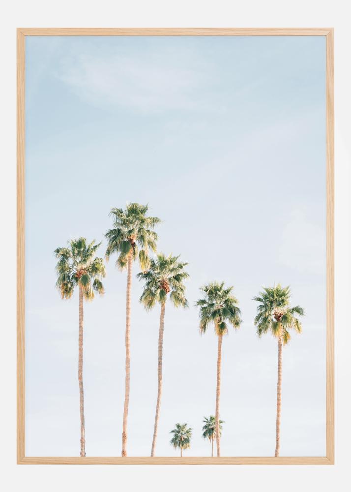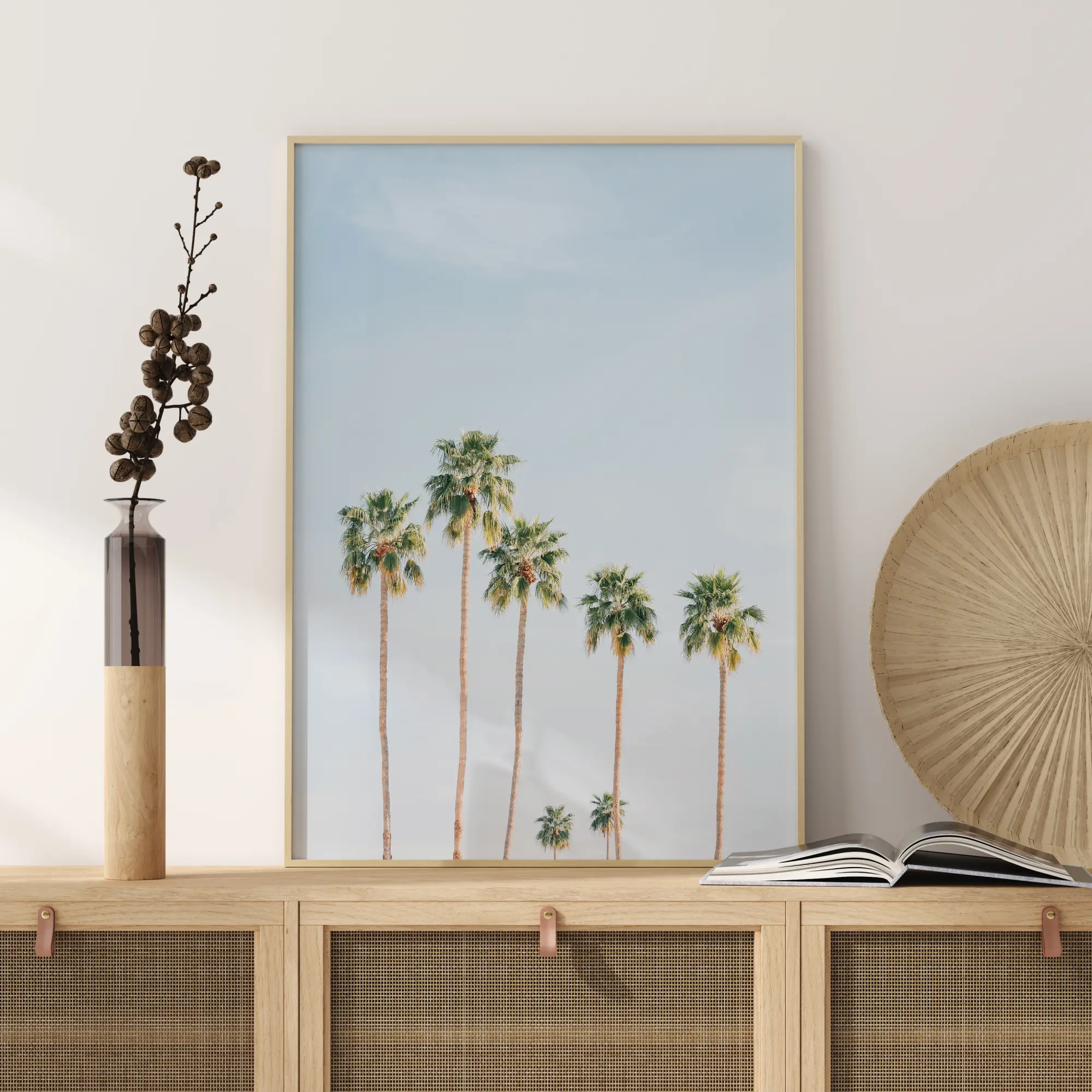 Une délicieuse affiche de cinq palmiers alignés. Le ciel bleu pâle se marie parfaitement avec les tons verts et bruns des palmiers. Deux autres palmiers sont visibles au loin. Un beau tirage à accrocher sur un mur bleu clair.