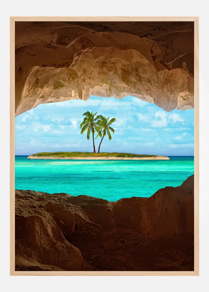 Une photo apaisante d'une île prise depuis l'intérieur d'une grotte ressemblant à un œil. En sortant de la grotte, l'eau bleue cristalline conduit le regard vers une petite île avec deux palmiers au milieu. Entourée d'herbe, cette affiche crée la destination idéale pour vos prochaines vacances.