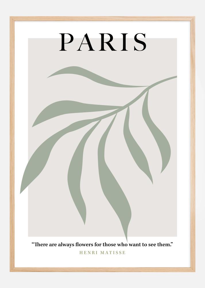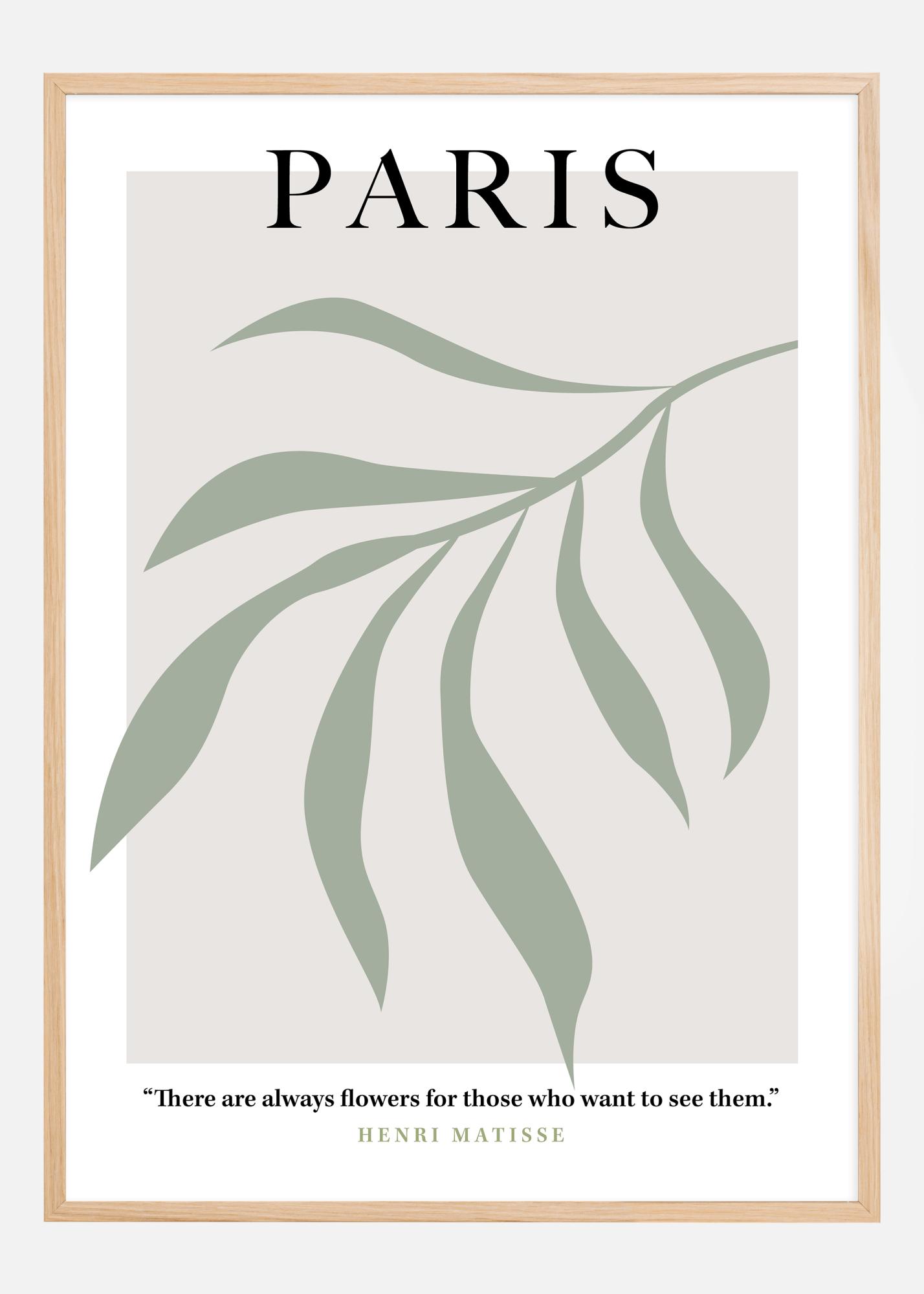 Ce poster élégant et raffiné porte le mot "PARIS" en grandes lettres, sur un fond de lignes vert tendre formant une forme abstraite et organique, rappelant les jardins calmes et frais. Sa palette atténuée confère une sensation de paix et d'élégance subtile, reflétant la réputation de la ville comme un centre de beauté et de culture. Il est complété par une citation inspirante d'Henri Matisse, qui donne à l'affiche une profondeur de sagesse artistique : "There are always flowers for those who want to see them."