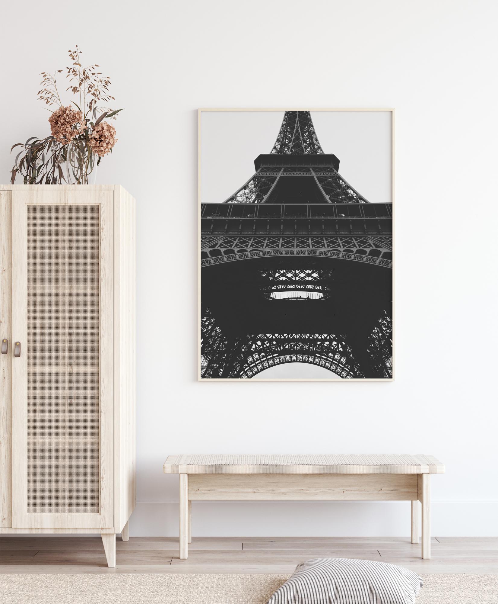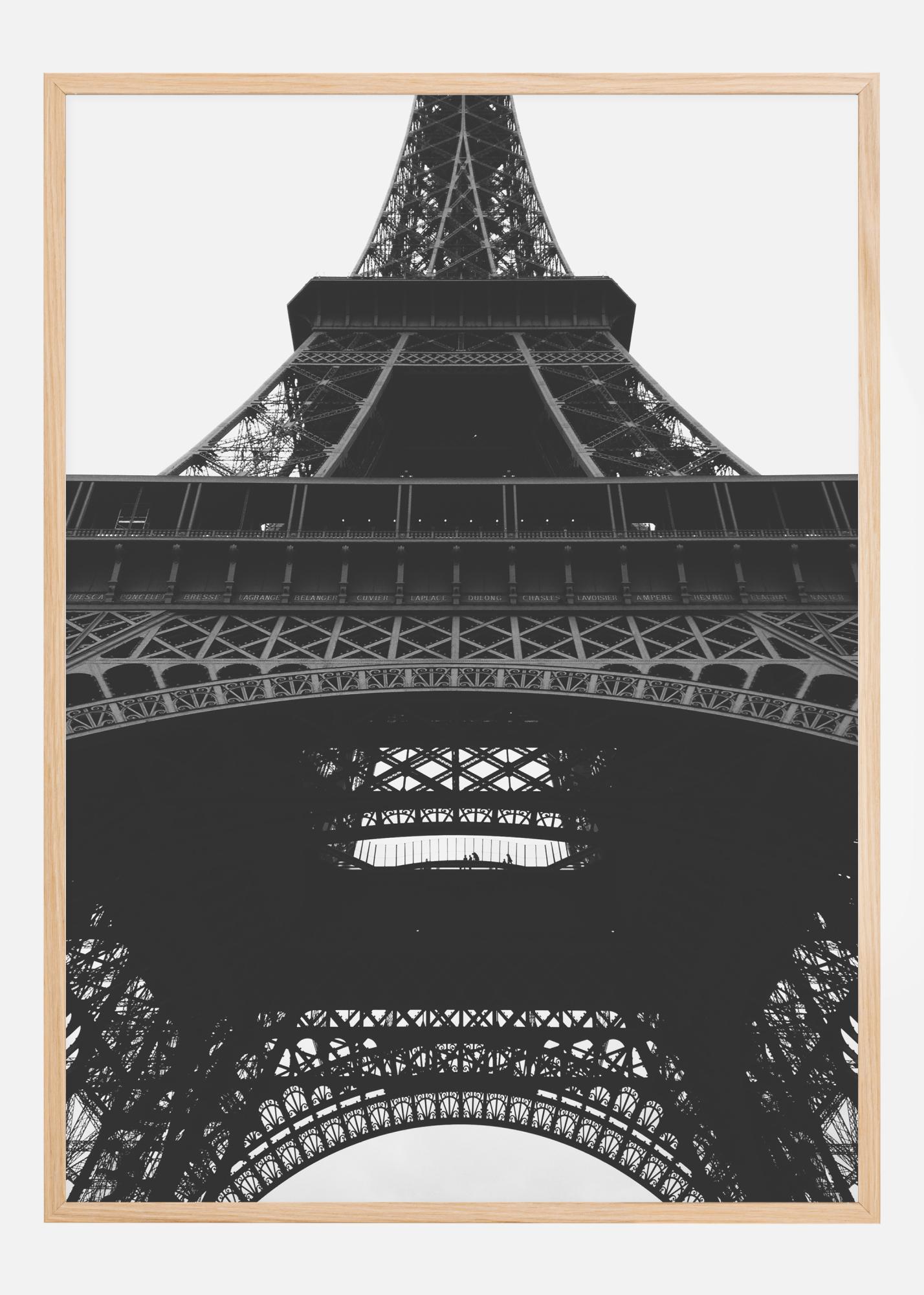 Une superbe affiche en noir et blanc de la Tour Eiffel. Prise de haut en bas, la structure en fer massif et puddlé se fond parfaitement dans le ciel gris. Ce chef-d'œuvre technologique crée une structure légère, aérée mais solide. Un tirage parfait à accrocher dans un environnement moderne.