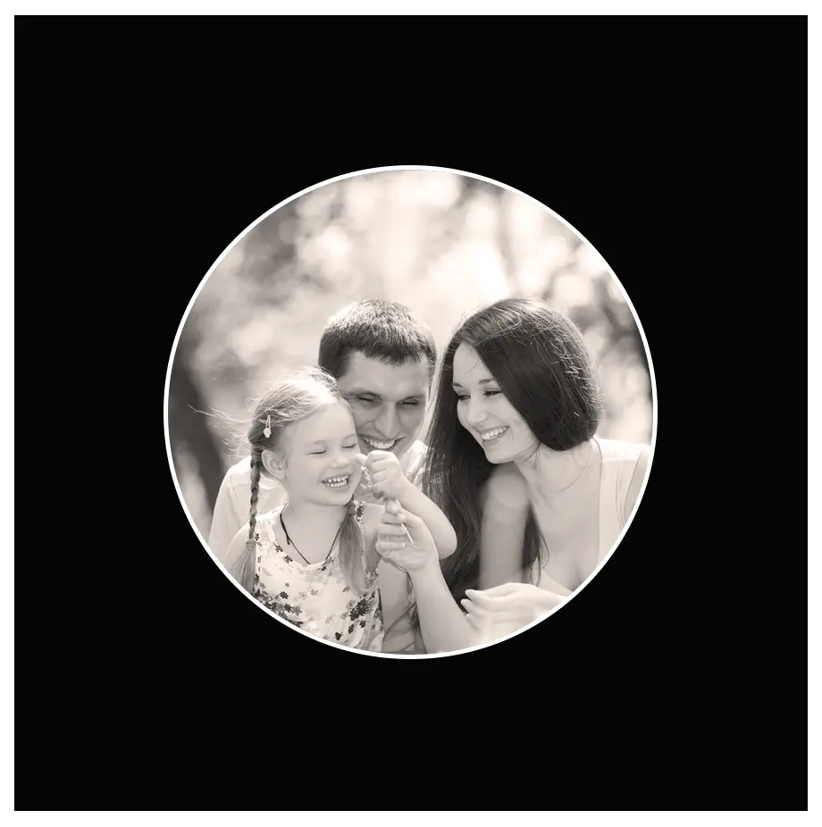 Passe-partout carré noir sans acide avec une ouverture pour photo ronde. Convient par exemple aux portraits. Ce passe-partout est de la plus haute qualité et le fait qu'il soit sans acide n'abîme pas vos photos.