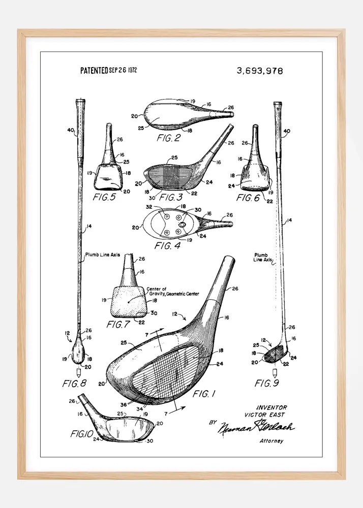 Cette affiche de brevet décrit un dessin de brevet élégant et techniquement détaillé d'un club de golf, breveté le 26 septembre 1972 sous le numéro 3,693,978. Les différentes figures, de la FIG. 1 à la FIG. 10, montrent le design du club sous plusieurs perspectives, mettant en valeur les détails réfléchis et l'équilibre de la construction. Cette illustration représente un mélange unique de technologie et de sport, et constitue un récit visuel fascinant de l'évolution du design dans le golf.