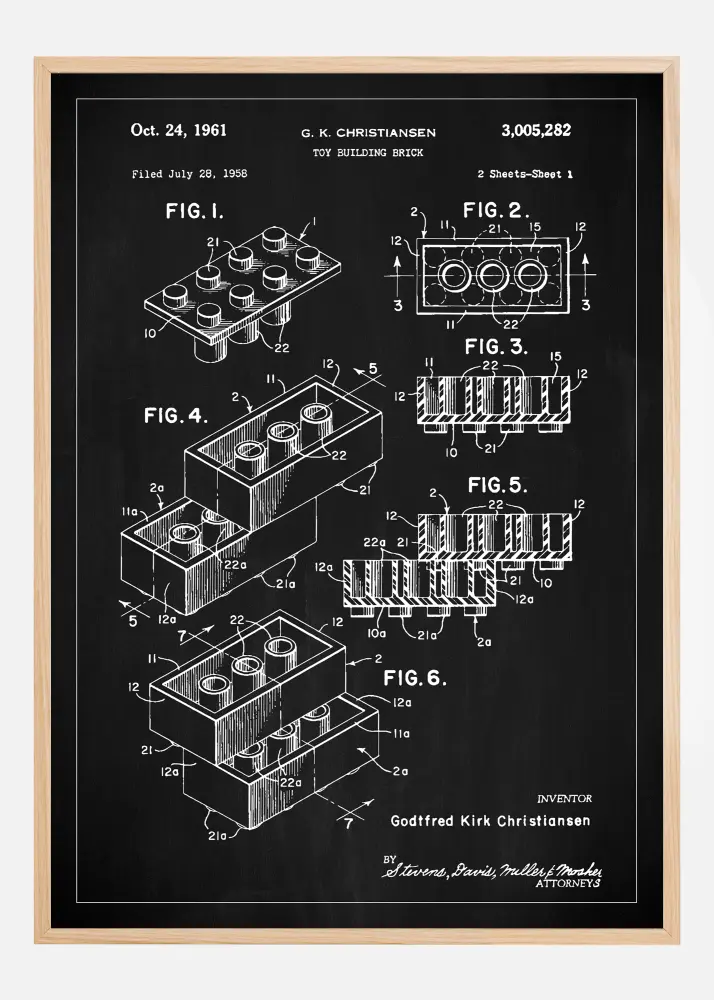 Cette affiche de brevet montre le design original pour la brique de construction révolutionnaire de Lego, une invention qui est devenue la pierre angulaire du jeu créatif dans le monde entier. Le brevet, avec le numéro 3,005,282, a été accordé le 24 octobre 1961 à l'inventeur Godtfred Kirk Christiansen, et représente un jalon dans l'histoire du design et des jouets.