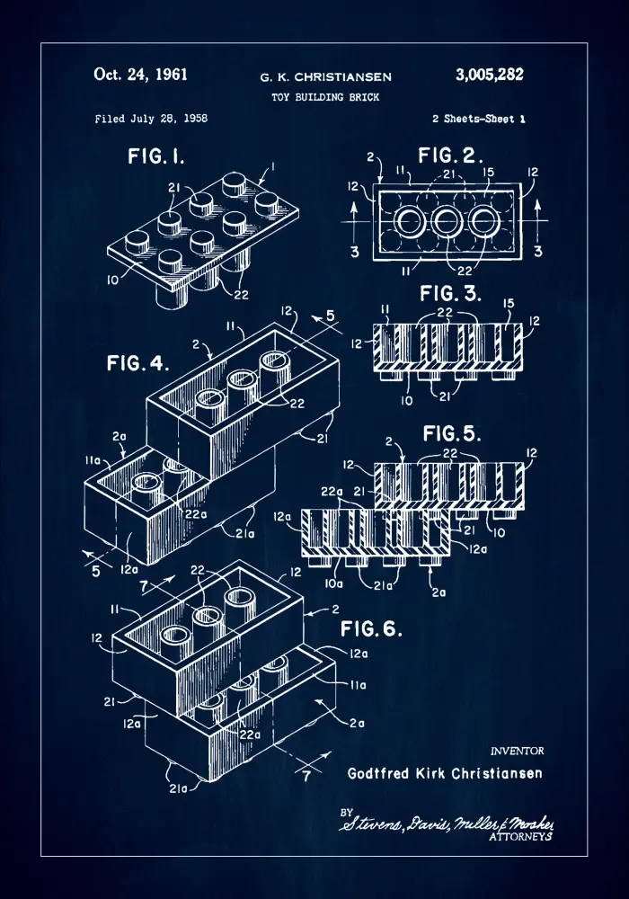 Cette affiche détaillée de brevet illustre le design ingénieux de la brique de construction en jouet de Lego qui a révolutionné le jeu créatif et l'apprentissage, créée par Godtfred Kirk Christiansen. Avec le numéro de brevet 3,005,282, accordé le 24 octobre 1961, cette illustration capture l'essence d'une invention qui a inspiré et ravi des générations de constructeurs et de penseurs.
